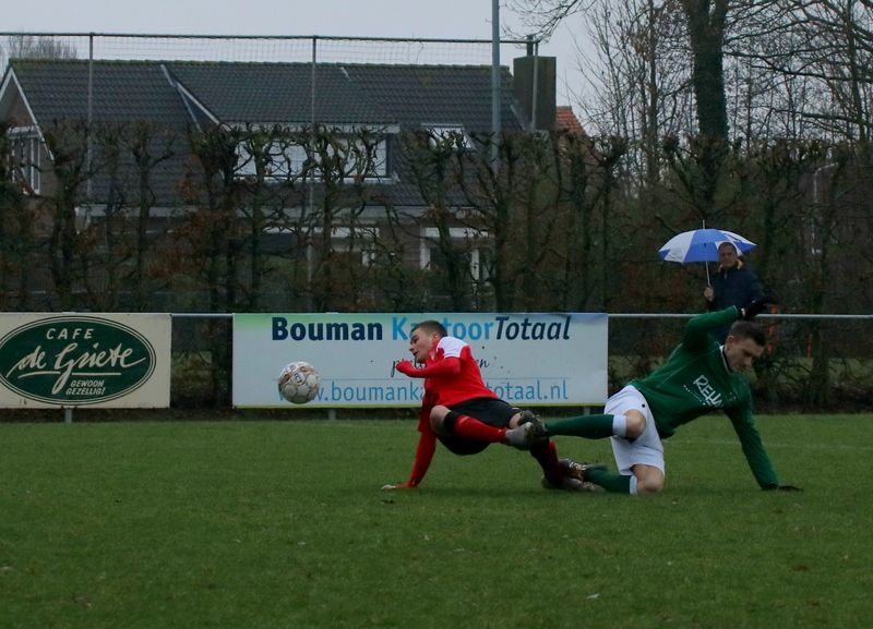 Zes minuten later kwamen onze groen-witten met de schrik vrij toen Juriën Dam, die centraal achterin een puike wedstrijd speelde, een vrije trap van RCS onbedoeld doorkopte en daarna Morad Bobouh de paal zag raken. Uiteindelijk kon doelman Dominique Pijpelink ingrijpen en was het gevaar geweken. In het vervolg van de 1e helft werden de bezoekers niet gevaarlijk meer, mede door het goede verdedigende werk van onze groen-witten. Soms ging het er behoorlijk fel aan toe, wat de nodige gele kaarten opleverde. De overtreding van middenvelder Hylke Stroo, die volgens de scheidsrechter doorgleed op het natte veld en zijn tegenstander ongelukkig raakte, liep slecht af voor RCS speler Stefan van Neutigem. Hij moest voor onderzoek naar de huisartsenpost. Hylke kreeg een gele kaart, daar waar de RCS aanhang liever een andere kleur had gezien.