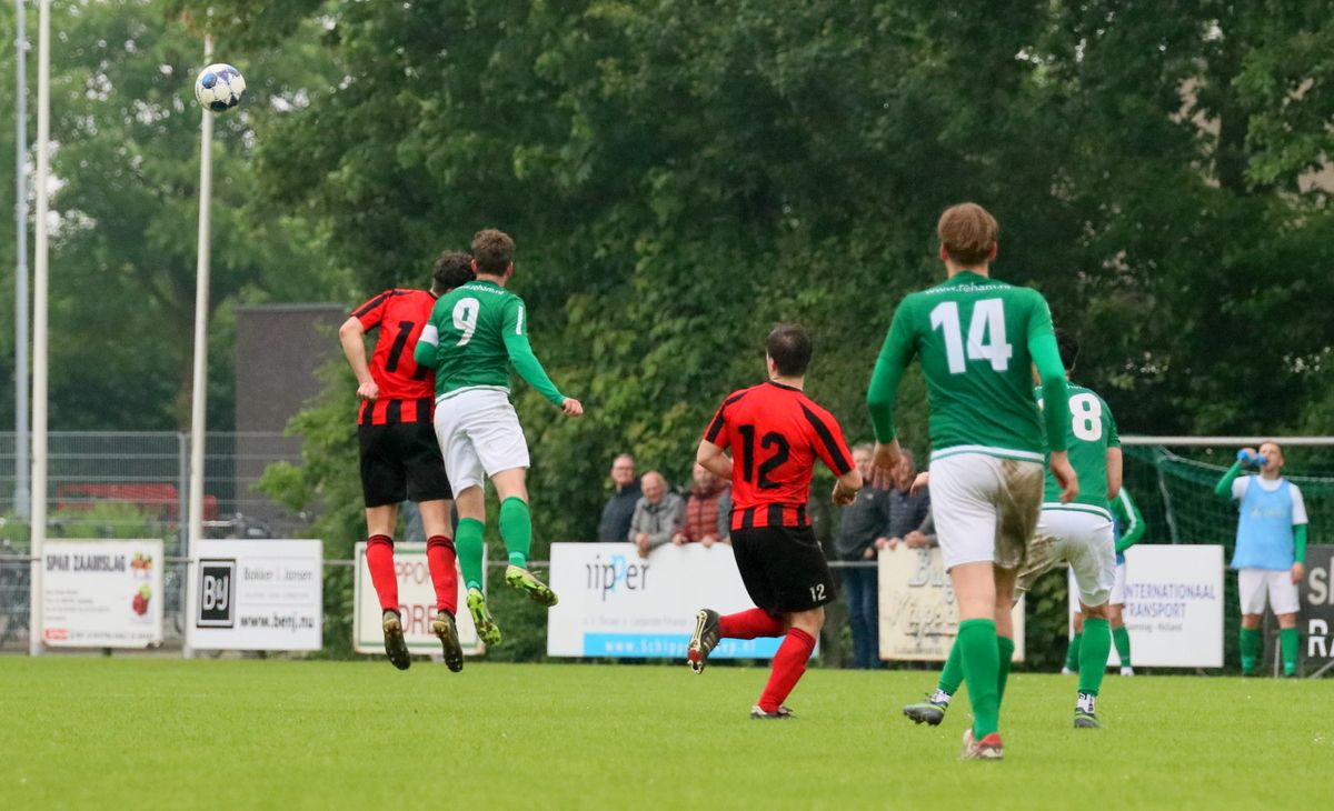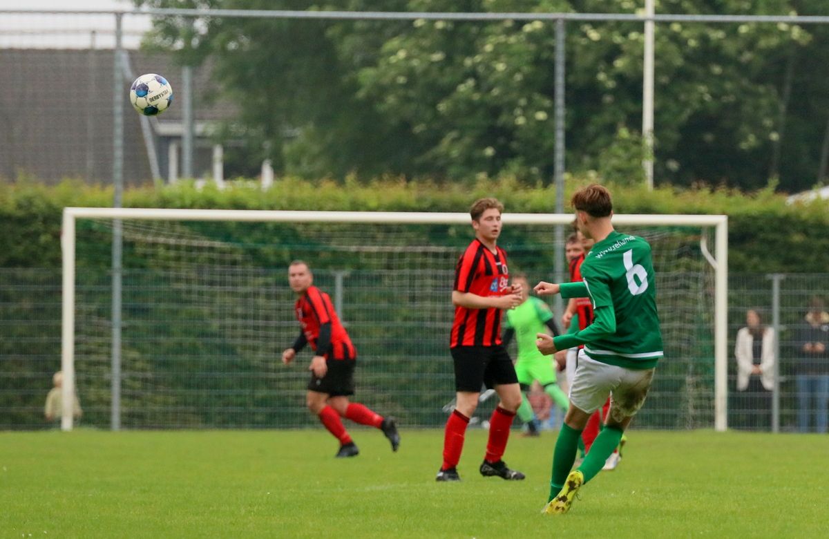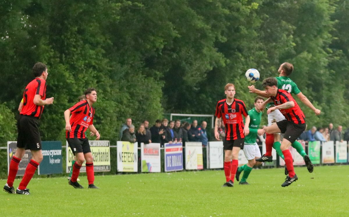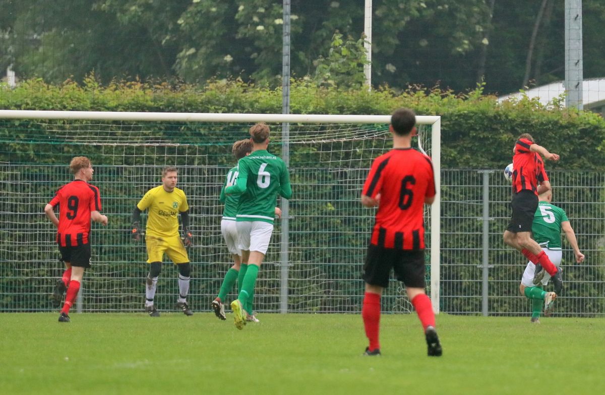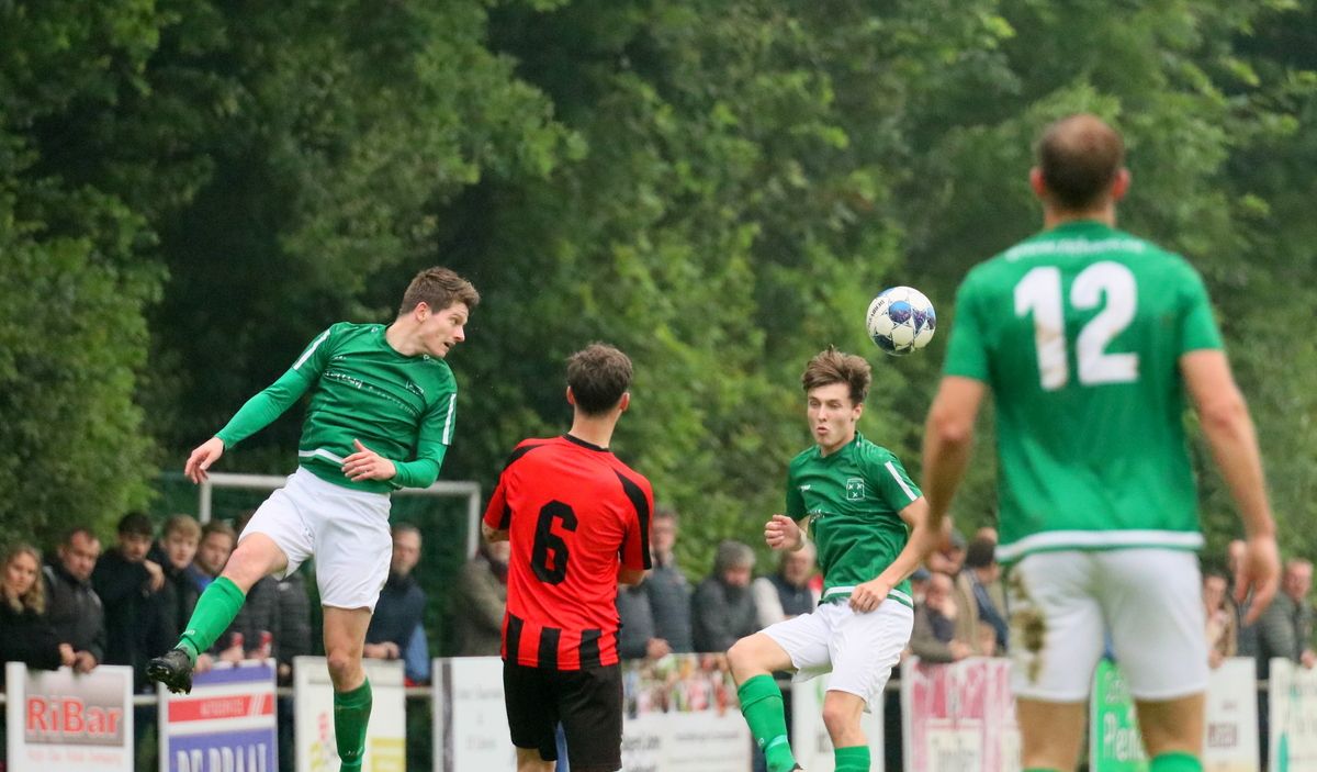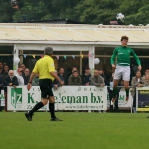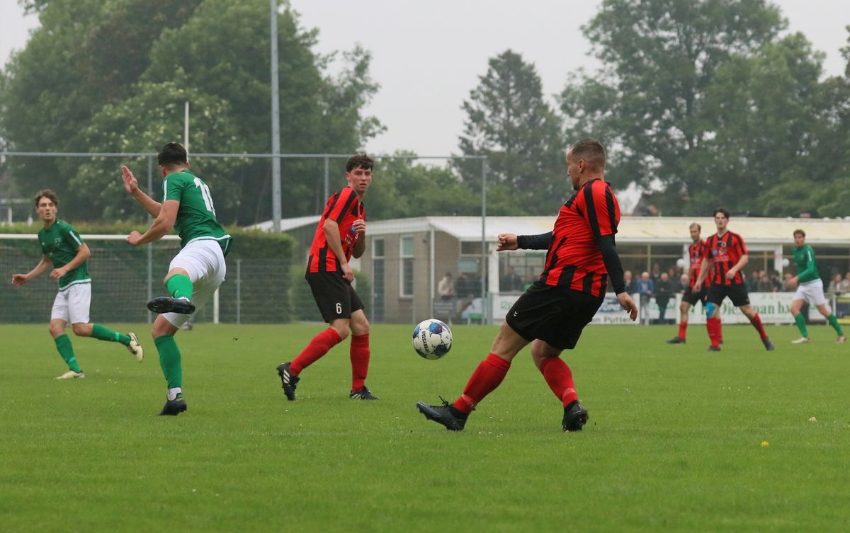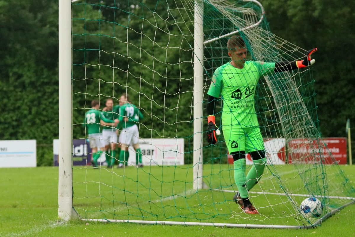 Gesterkt door de vroege voorsprong speelden onze groen-witten verzorgd voetbal. Rustig verlegden ze het spel van de ene naar de andere kant op zoek naar een opening in de compacte verdediging van de bezoekers. Dat lukte nauwelijks en het was de ploeg uit Kamperland die in de omschakeling razendsnel eruit kwam en de gevaarlijkste ploeg was. Dat resulteerde halverwege de 1e helft in een aantal grote kansen. Eerst was het Sam de Bruine die, nadat hij Fabrice van Holsbeke aan de zijlijn had afgeschut, voorlangs schoot en een tweetal minuten later moest doelman Bryan Buren met de voet redding brengen op een inzet van alweer Jim Strating. Onze groen-witten kwamen steeds meer onder druk te staan en hadden meerdere kleine overtredingen nodig om overeind te blijven. Dat lukte, maar dat was zeer zeker ook de verdienste van sluitpost Bryan Buren, die een geweldige wedstrijd stond te keepen. Zo had hij op het half uur een geweldige reflex in huis op een inzet van Quinten Leenpoel.