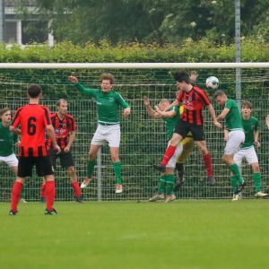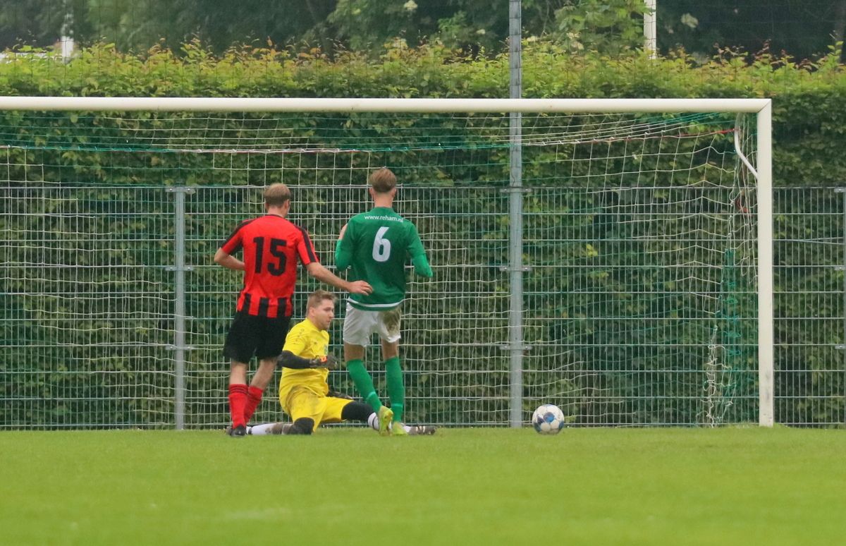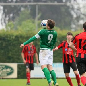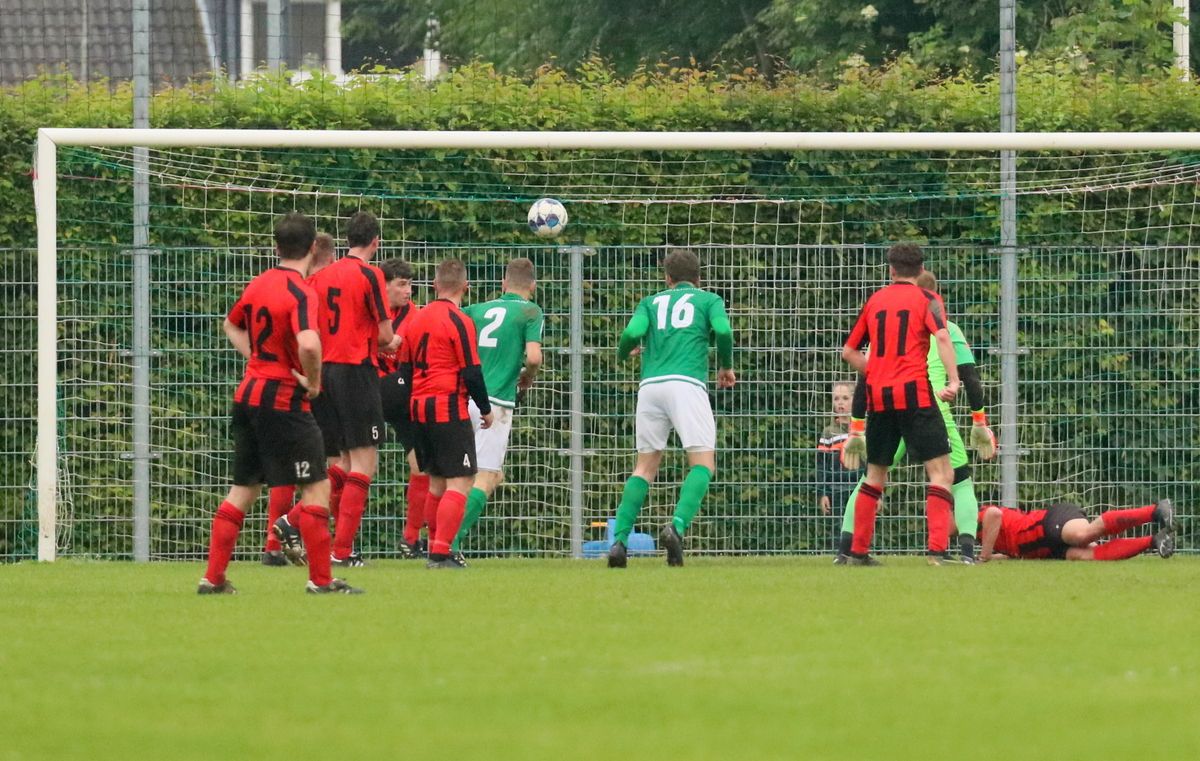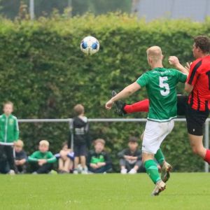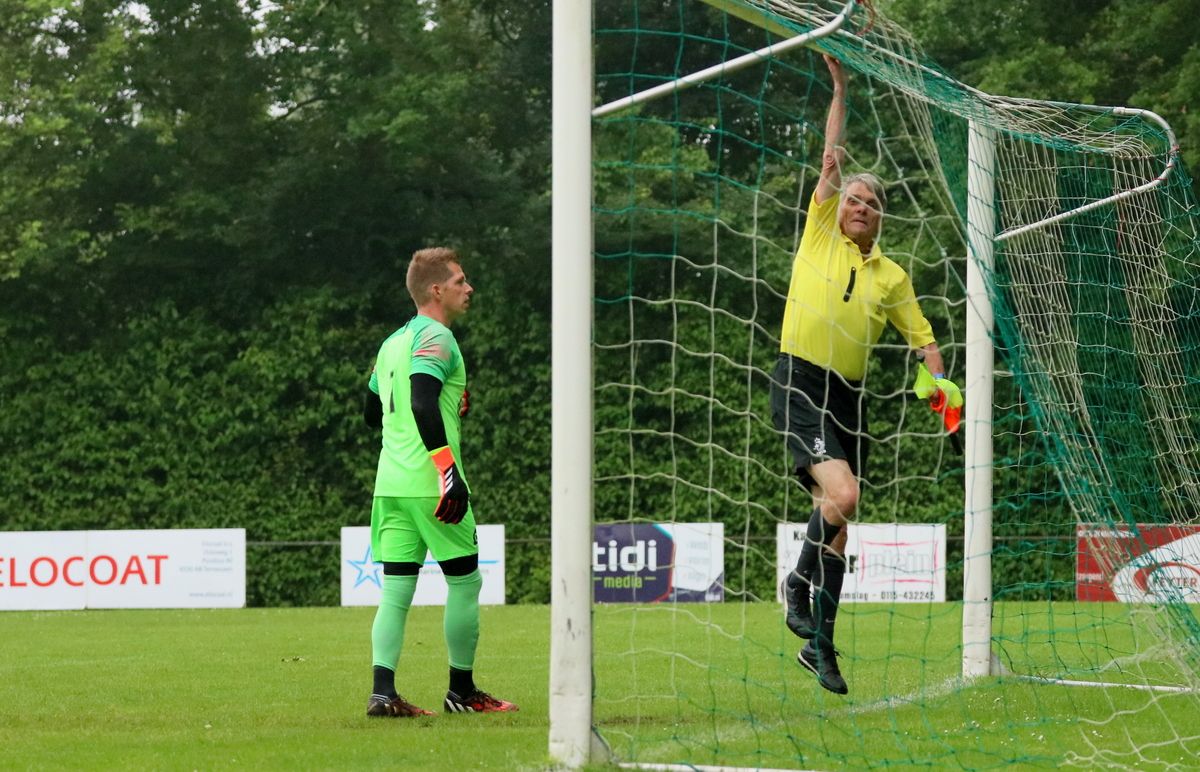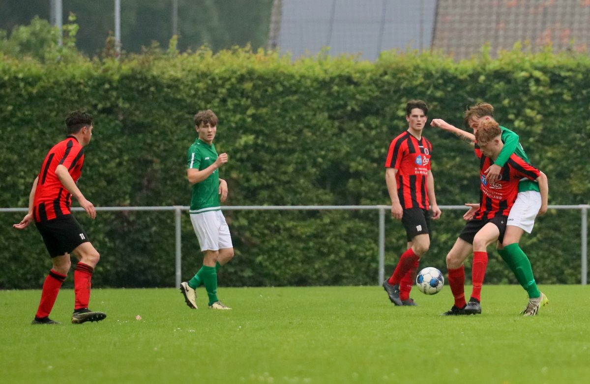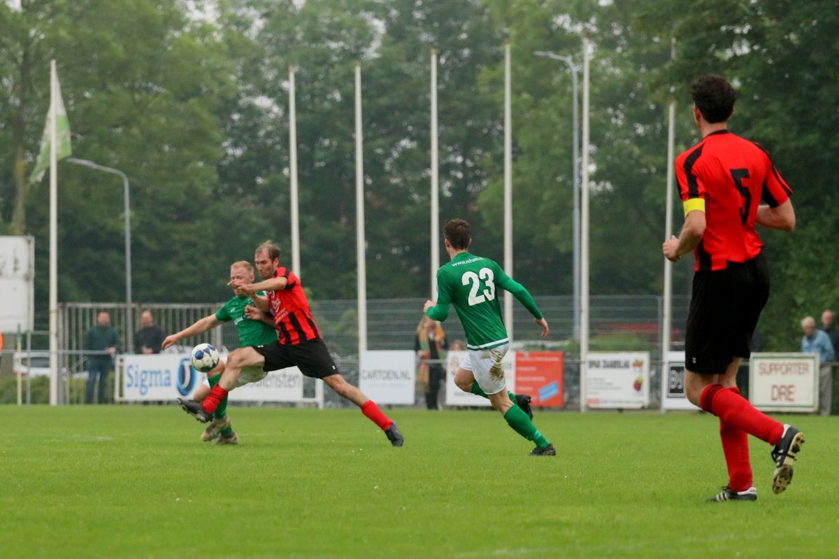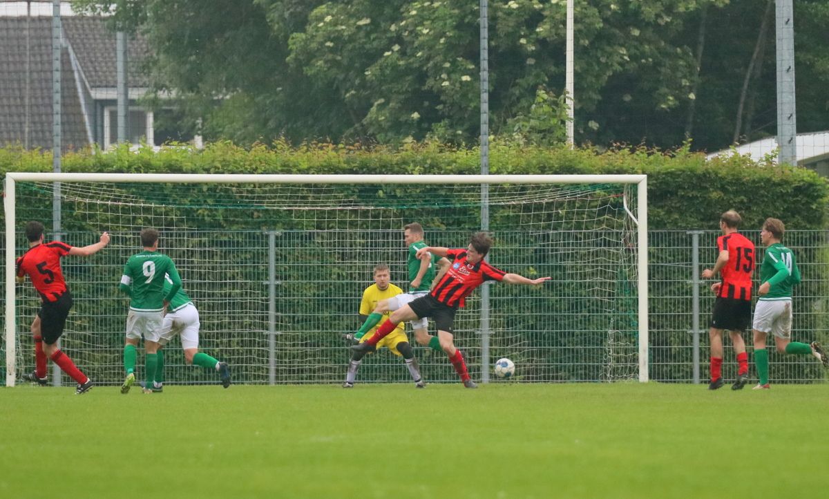 Gesterkt door de vroege voorsprong speelden onze groen-witten verzorgd voetbal. Rustig verlegden ze het spel van de ene naar de andere kant op zoek naar een opening in de compacte verdediging van de bezoekers. Dat lukte nauwelijks en het was de ploeg uit Kamperland die in de omschakeling razendsnel eruit kwam en de gevaarlijkste ploeg was. Dat resulteerde halverwege de 1e helft in een aantal grote kansen. Eerst was het Sam de Bruine die, nadat hij Fabrice van Holsbeke aan de zijlijn had afgeschut, voorlangs schoot en een tweetal minuten later moest doelman Bryan Buren met de voet redding brengen op een inzet van alweer Jim Strating. Onze groen-witten kwamen steeds meer onder druk te staan en hadden meerdere kleine overtredingen nodig om overeind te blijven. Dat lukte, maar dat was zeer zeker ook de verdienste van sluitpost Bryan Buren, die een geweldige wedstrijd stond te keepen. Zo had hij op het half uur een geweldige reflex in huis op een inzet van Quinten Leenpoel.