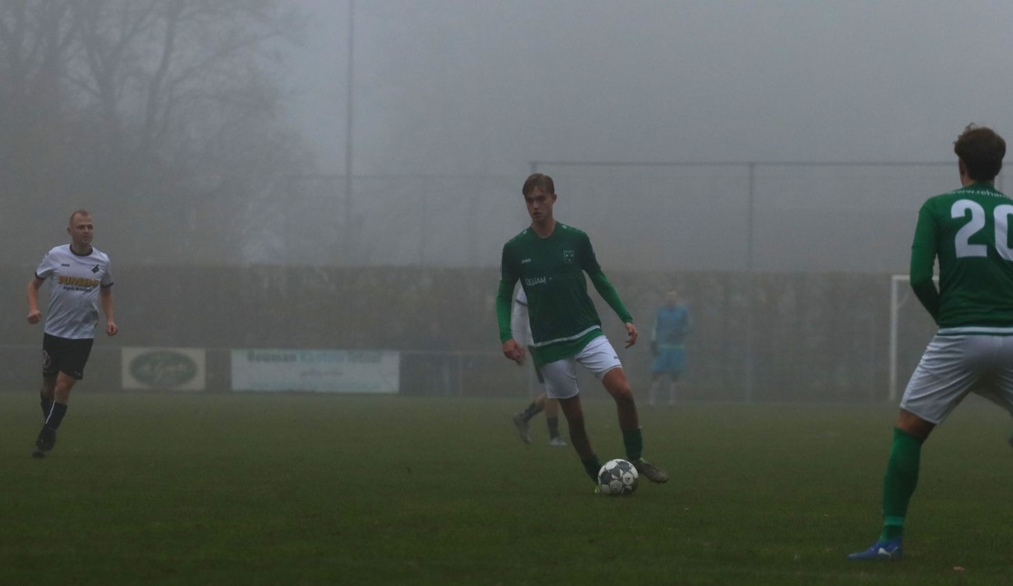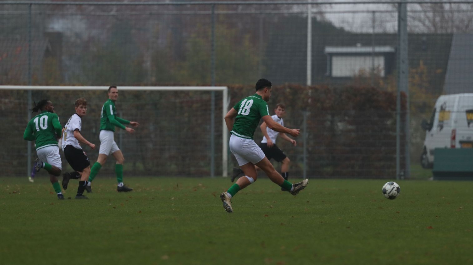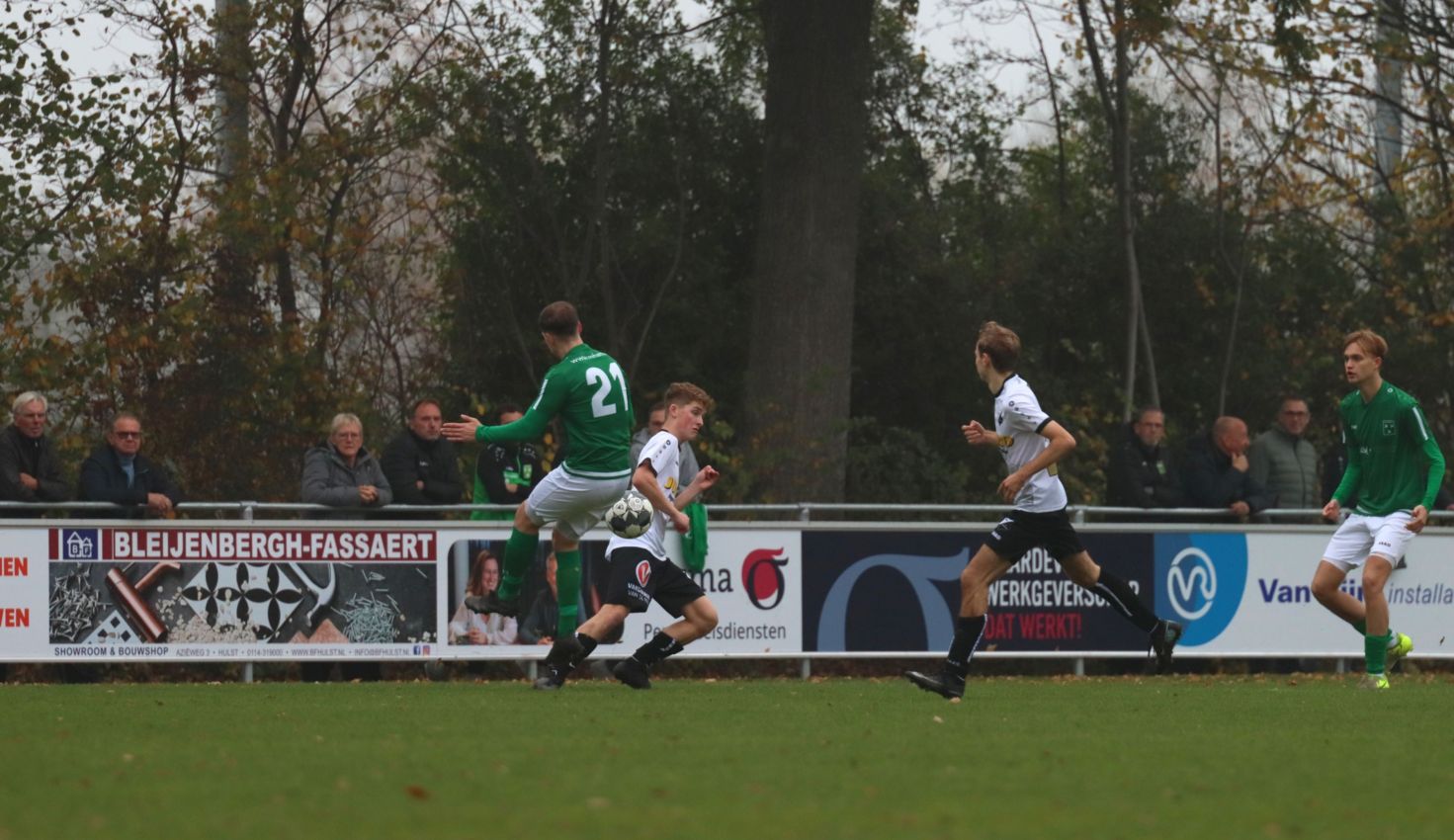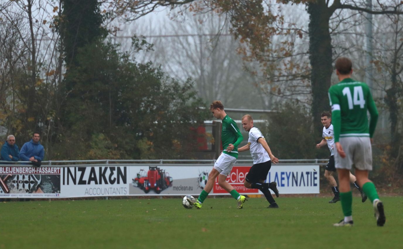 Fabian Wilson moest het ook tegen Breskens stellen zonder routinier Koen Post, die nog te veel last bleek te hebben van zijn enkelblessure. Verder stonden alle vertrouwde namen op het wedstrijdformulier, inclusief Aaron Buijze, die voor het eerst onderdeel uitmaakte van de selectie. Ook Timme Vinke, die de geblesseerde Quinten Mel verving als reserve doelman, was aan de selectie toegevoegd. De zeer gedreven oefenmeester had gekozen voor dezelfde basis elf als een week geleden en zag dat ze vol zelfvertrouwen van start gingen na het eerste fluitsignaal van scheidsrechter G.G.T. (Gerard) Verkuil uit Hoedekenskerke. Echter ook Breskens liet zich niet onbetuigd en ging aanvallend van start, wat een enerverend begin van dit duel opleverde. Naarmate de wedstrijd vorderde trokken onze groen-witten het initiatief naar zich toe, maar het veelvuldige balbezit leverde amper uitgespeelde kansen op. Tegelijkertijd moesten onze groen-witten op hun qui-vive zijn voor de haarscherpe counters van de bezoekers. Na een kwartier wedstrijd leek Breskens daarmee voor het eerst kansrijk te worden. Na balverlies van onze groen-witten op de helft van de bezoekers zette Tim van Hasselt de tegenaanval in na een combinatie met Jarmo Gilling, maar door uitstekend verdedigend werk van Fabrice van Holsbeke werd Tim van Hasselt de kans om de score te openen ontnomen.