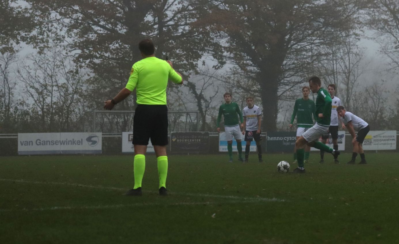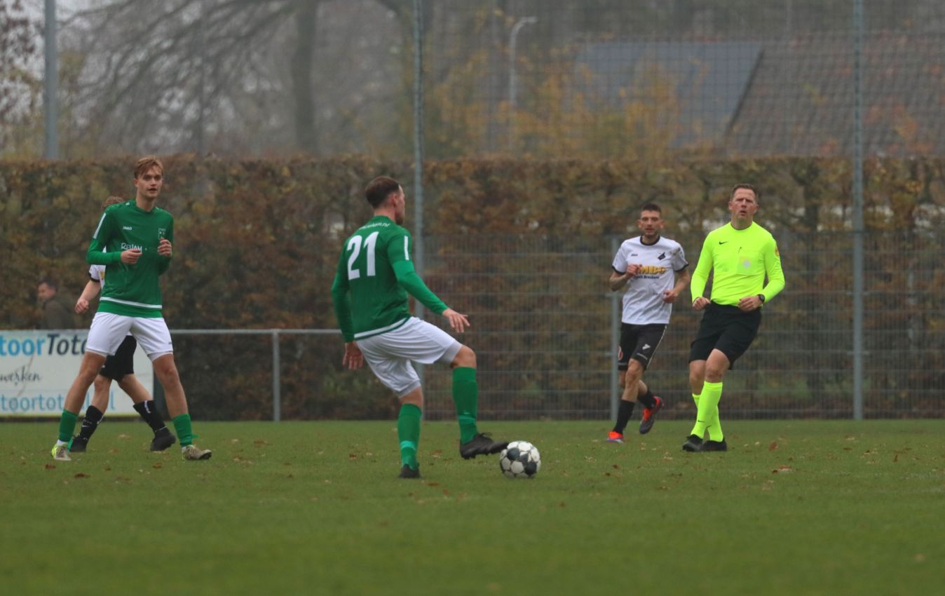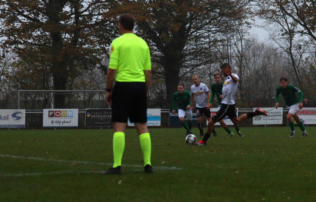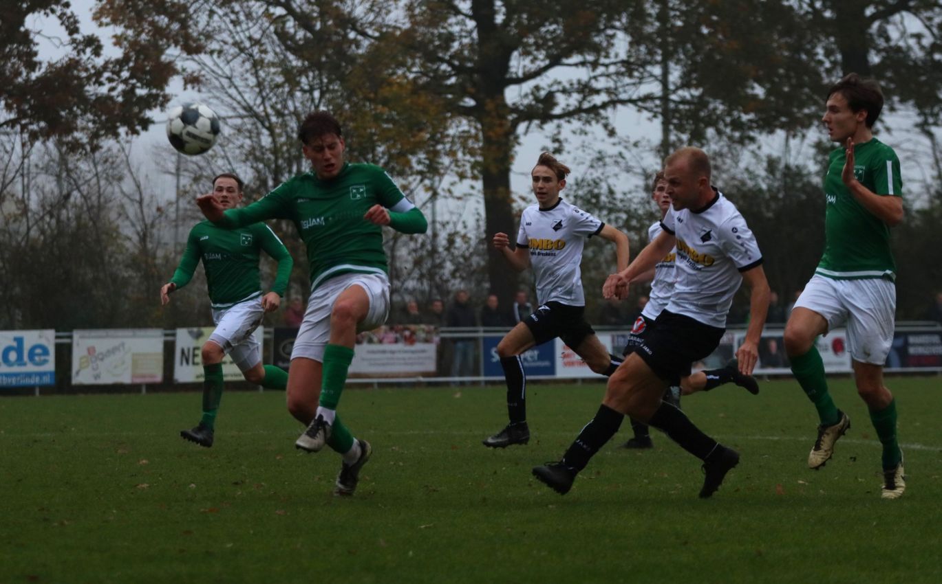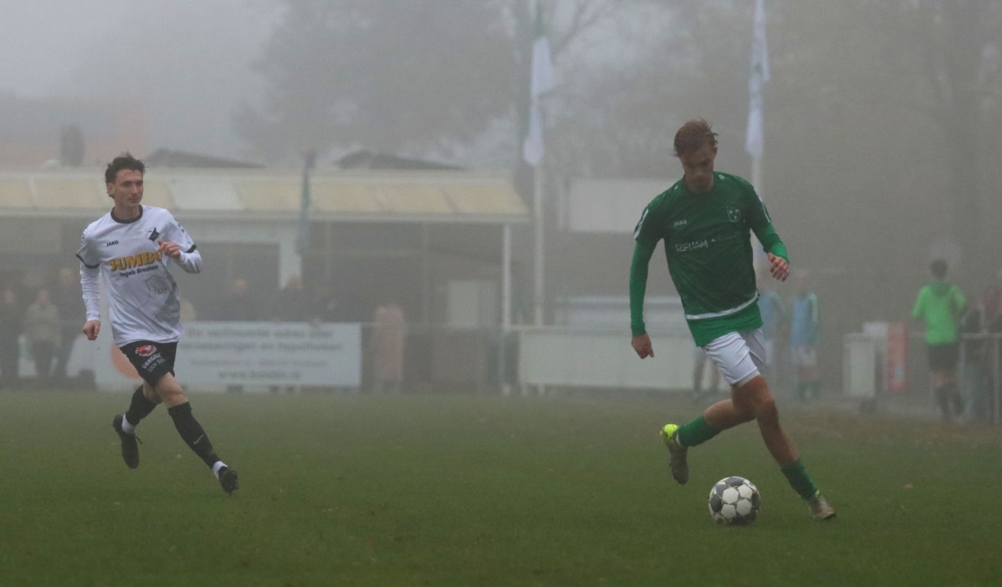 Onze groen-witten bleken niet voor het eerst dit seizoen verdedigend hun zaakjes goed op orde te hebben, waardoor weinig tot geen kansen werden prijsgegeven en doelman Dominique Pijpelink eigenlijk weinig werk te verrichten had. Daar stond tegenover dat ze zelf ook weinig wisten te creëren. Halverwege het eerste bedrijf zag Wout Hamelink na een individuele actie zijn inzet in het zijnet eindigen en na ruim een half uur leek Kevin Segers een voorzet van links van diezelfde Wout Hamelink tot doelpunt te promoveren, maar door ingrijpen van doelman Thijs van Houte en een ploeggenoot kon de bal voor de doellijn worden weggewerkt. Twee minuten daarvoor had de bank van Breskens graag gewild dat de bal op de stip was gelegd toen de bal tegen de arm van Lars de Jonge werd geschoten. Zijn arm hing echter keurig langs het lichaam, dus wilde scheidsrechter Verkuil terecht van geen strafschop weten. Voetballend hadden onze groen-witten het betere van het spel, met een uitstekend spelende Teun van Fraeijenhove op het middenveld. Daar stond tegenover dat de bezoekers voor meer dreiging zorgden. Kort voor rust leek Jan Meijaard op weg naar het openingsdoelpunt, maar op het moment van afdrukken werd hij net voldoende gehinderd waardoor zijn schot hoog over het doel verdween. Toch gingen beide ploegen niet met de bekende brillenstand om de thee, want in de laatste minuut van de officiële speeltijd veroorzaakte Arno Scheele een strafschop. Een diepe crosspass kwam op links terecht bij Laurens Reijnvoet, die net even teveel ruimte kreeg en naar binnen kon snijden en vervolgens werd neergelegd door de centrale verdediger. Er was geen enkele discussie of dit wel of geen strafschop was. Scheidsrechter Verkuil wees dan ook gedecideerd naar de stip, waarna Tim van Hasselt het vonnis velde en doelman Dominique Pijpelink de verkeerde hoek instuurde. Beide ploegen gingen dus met een 0-1 tussenstand de rust in.