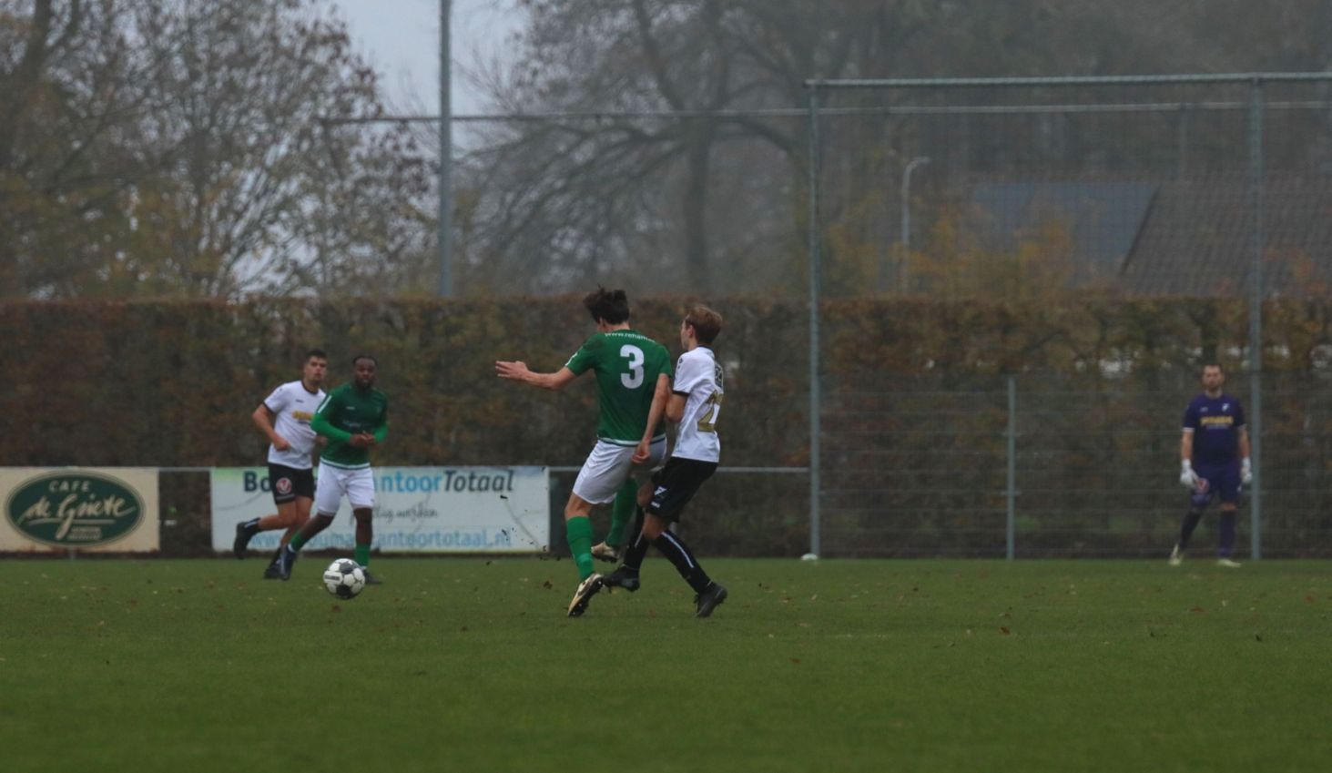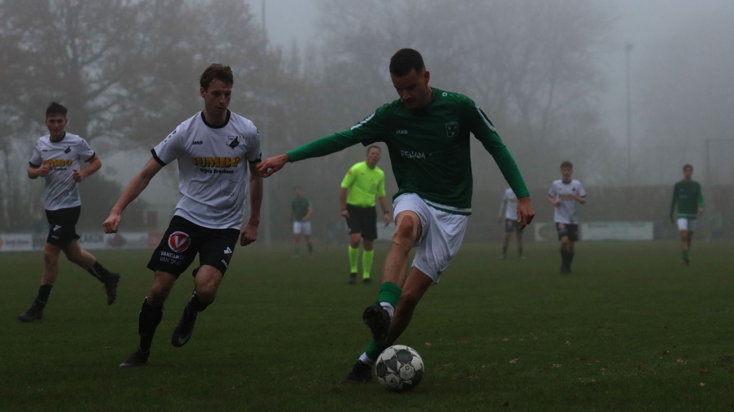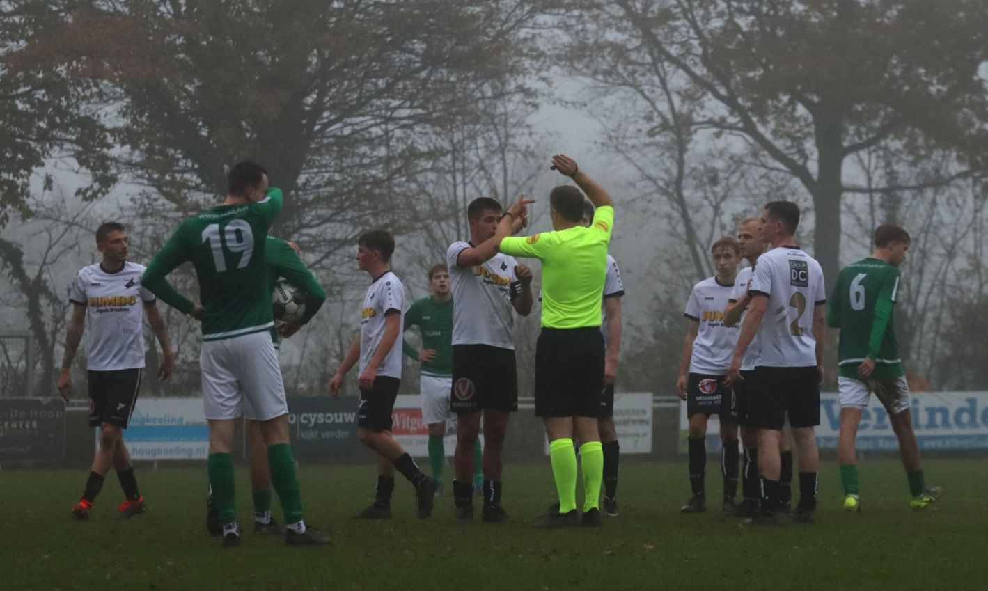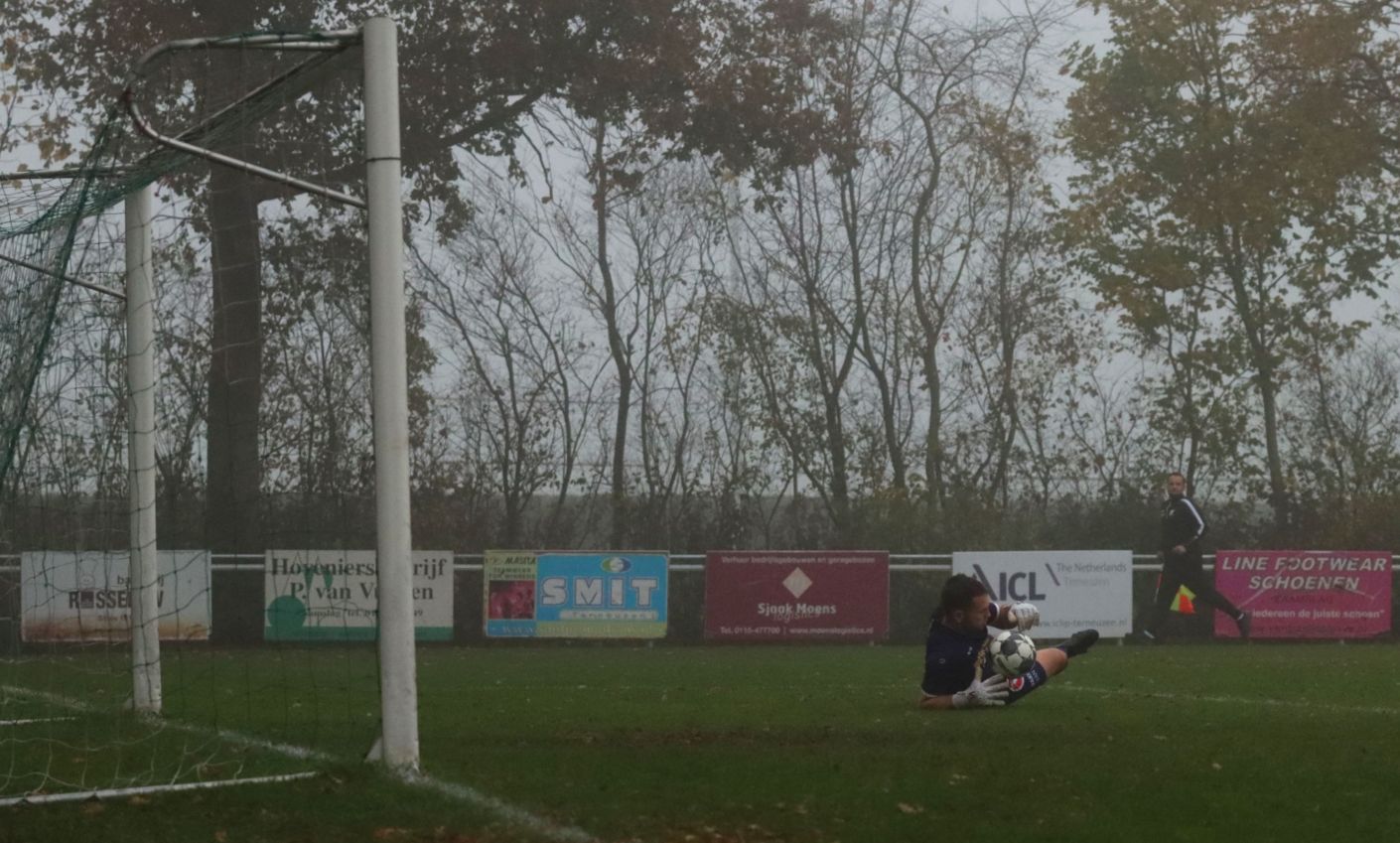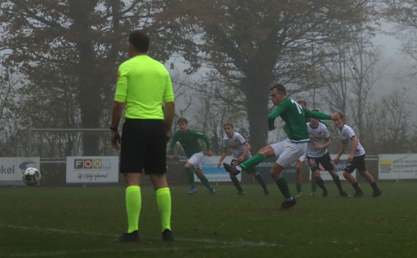 Onze groen-witten bleken niet voor het eerst dit seizoen verdedigend hun zaakjes goed op orde te hebben, waardoor weinig tot geen kansen werden prijsgegeven en doelman Dominique Pijpelink eigenlijk weinig werk te verrichten had. Daar stond tegenover dat ze zelf ook weinig wisten te creëren. Halverwege het eerste bedrijf zag Wout Hamelink na een individuele actie zijn inzet in het zijnet eindigen en na ruim een half uur leek Kevin Segers een voorzet van links van diezelfde Wout Hamelink tot doelpunt te promoveren, maar door ingrijpen van doelman Thijs van Houte en een ploeggenoot kon de bal voor de doellijn worden weggewerkt. Twee minuten daarvoor had de bank van Breskens graag gewild dat de bal op de stip was gelegd toen de bal tegen de arm van Lars de Jonge werd geschoten. Zijn arm hing echter keurig langs het lichaam, dus wilde scheidsrechter Verkuil terecht van geen strafschop weten. Voetballend hadden onze groen-witten het betere van het spel, met een uitstekend spelende Teun van Fraeijenhove op het middenveld. Daar stond tegenover dat de bezoekers voor meer dreiging zorgden. Kort voor rust leek Jan Meijaard op weg naar het openingsdoelpunt, maar op het moment van afdrukken werd hij net voldoende gehinderd waardoor zijn schot hoog over het doel verdween. Toch gingen beide ploegen niet met de bekende brillenstand om de thee, want in de laatste minuut van de officiële speeltijd veroorzaakte Arno Scheele een strafschop. Een diepe crosspass kwam op links terecht bij Laurens Reijnvoet, die net even teveel ruimte kreeg en naar binnen kon snijden en vervolgens werd neergelegd door de centrale verdediger. Er was geen enkele discussie of dit wel of geen strafschop was. Scheidsrechter Verkuil wees dan ook gedecideerd naar de stip, waarna Tim van Hasselt het vonnis velde en doelman Dominique Pijpelink de verkeerde hoek instuurde. Beide ploegen gingen dus met een 0-1 tussenstand de rust in.