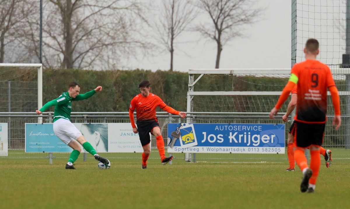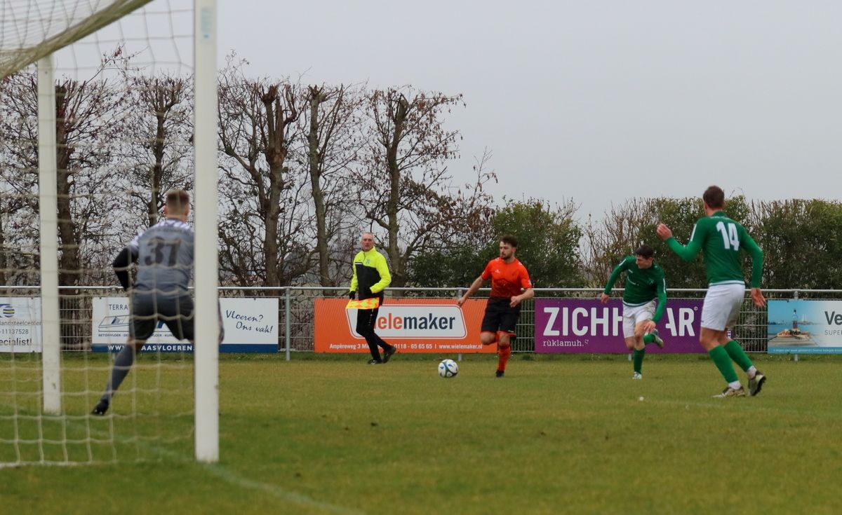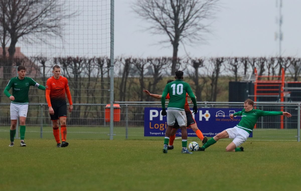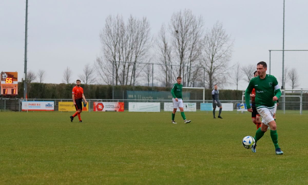 Wolfaartsdijk kwam iets beter uit de kleedkamer dan onze groen-witten, die nog steeds met dezelfde elf op zoek gingen naar een nieuwe voorsprong. In het eerste kwartier was de thuisploeg meer op de helft van onze groen-witten te vinden, maar de solide ogende defensie gaf weer weinig weg. Gevaar was er met regelmaat wel voor het doel van Wolfaartsdijk. Een uitval via Wout Hamelink eindigde na een kleine tien minuten in de handen van doelman Gomes. Pas na ruim een uur wedstrijd kreeg de thuisploeg een behoorlijke kans, maar via via verdween de bal in de veilige handschoenen van Quinten Mel. Het antwoord van onze groen-witten liet weer niet lang op zich wachten. Wederom was het Wout Hamelink die het de Wolfaartsdijk defensie knap lastig maakte. Uiteindelijk trof hij weer doelman Gomes op zijn pad, die met de voet redding bracht. Nog steeds stond de 1-1 stand op het scorebord en inmiddels waren de laatste twintig minuten aangebroken. Op dat moment kreeg de thuisploeg de kans om op voorsprong te komen, maar een kopbal in kansrijke positie verdween over het doel. De spanning nam zienderogen toe, zou er nog een winnaar komen ? Die kwam er uiteindelijk. Het waren onze groen-witten die op het middenveld de aanvalsopbouw verlegden van rechts naar links en vervolgens over de linkerflank razendsnel toesloegen. Brian van Hoorn ontdeed zich van zijn tegenstander en stuurde Wout Hamelink diep. De vleugelaanvaller had er goed het oog in waar zijn medespelers zich bevonden. Hij schoof de bal voor de voeten van Michael Christina, die goed was gevolgd, niet nadacht en uithaalde. Zijn schot werd onderweg nog aangeraakt door een Wolfaartsdijk verdediger waardoor doelman Gomes het nakijken had. De slotminuten waren vervolgens heel spannend, maar de 1-2 bleef op het scorebord staan. Uiteindelijk een meer dan verdiende zege voor de ploeg van Fabian Wilson, die in verband met alle pijntjes her en der een weekje rust krijgt.