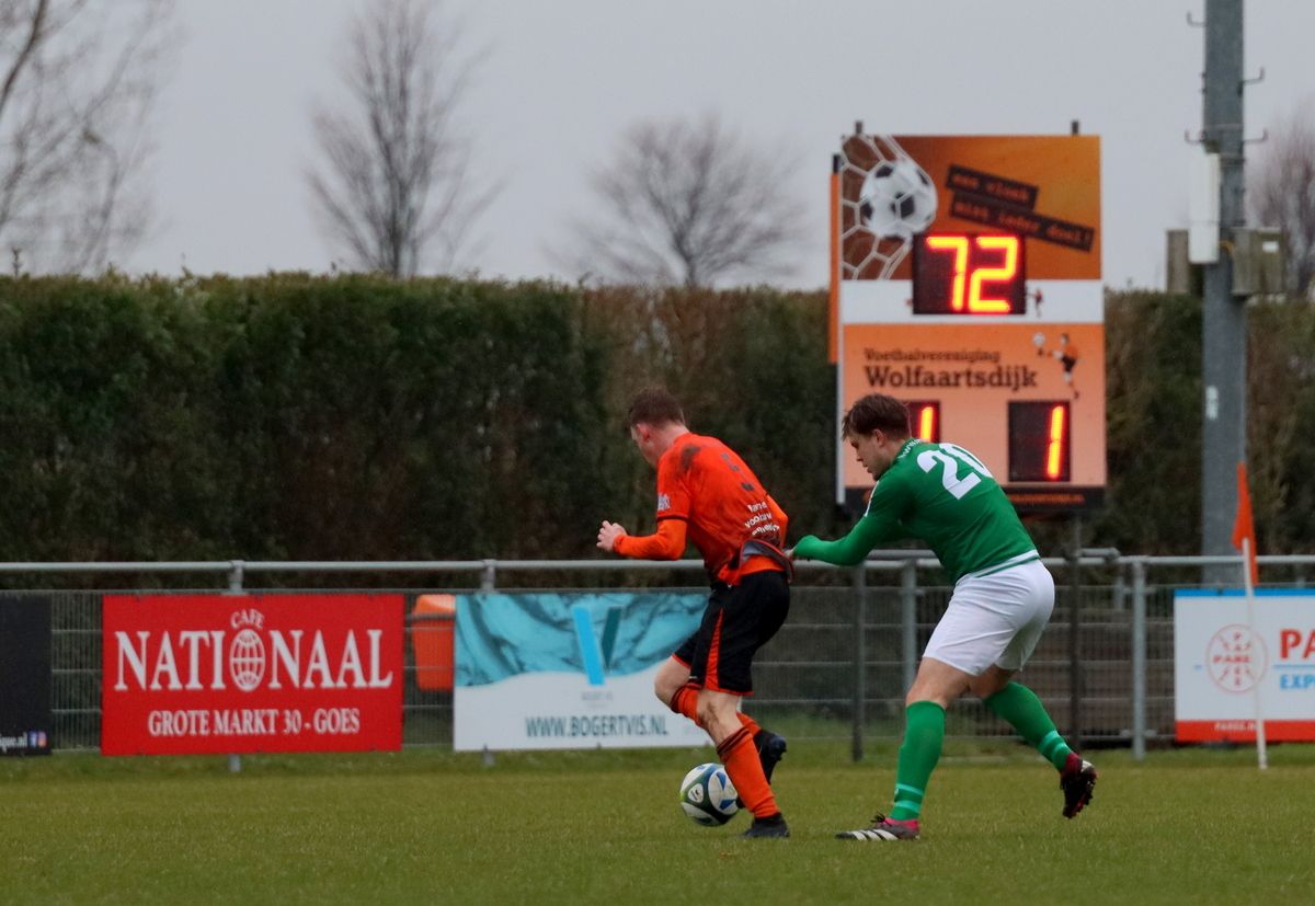 Op bezoek bij Wolfaartsdijk stond er veel op het spel. Behalve dat de winnaar van deze tweestrijd zich stevig in de top drie van de ranglijst zou nestelen, was er ook een kans om in het bezit te komen van de 2e periodetitel (overname van De Patrijzen, dat de 1e periode al op haar naam had geschreven). Daarbij waren beiden afhankelijk van het resultaat van Lewedorpse Boys, dat thuis aantrad tegen DwO’15. De kans dat de thuisploeg aan het langste eind zou trekken was klein, want dan moest het zelf winnen en moest Lebo verliezen. Voor onze groen-witten daarentegen was er op voorhand een grotere kans, omdat zowel Lebo als Zaamslag tot vandaag 12 punten hadden vergaard en het doelsaldo licht in het voordeel van de ploeg van Fabian Wilson was (15-11 om 12-9). Het devies was dus om zelf te winnen en hopen dat Lebo de wedstrijd tegen DwO’15 niet met al te grote cijfers zou winnen, want in dat geval zou de 2e periode naar Lewedorp gaan. Het laatste gebeurde dus toch, Lebo won met 3-0 en dus kwamen onze groen-witten één doelpunt tekort om de periode op hun naam te schrijven.