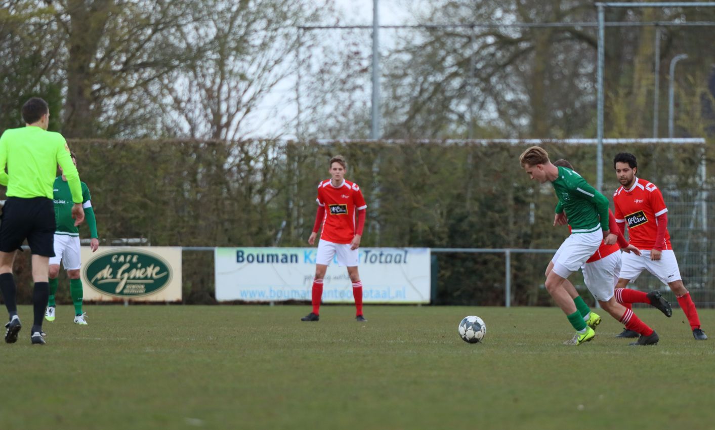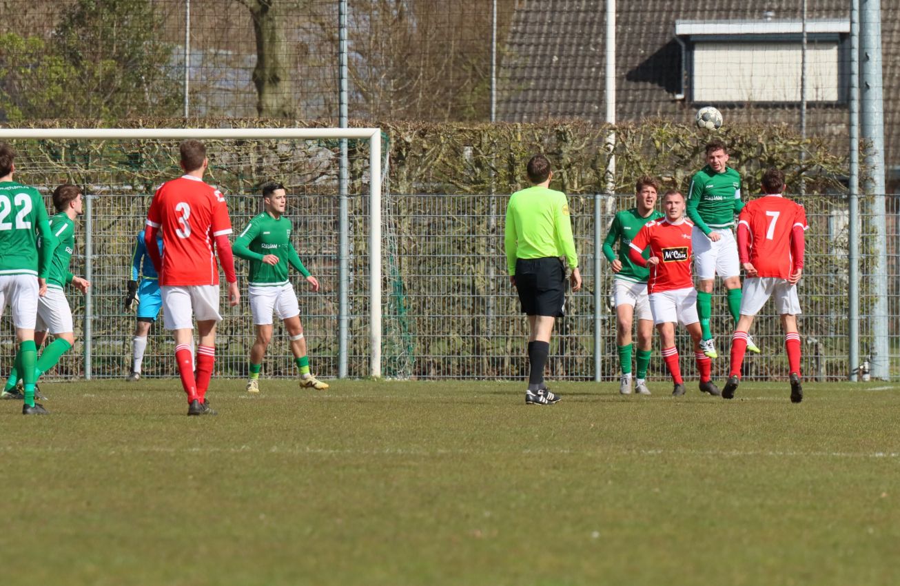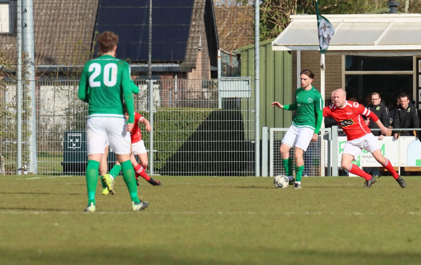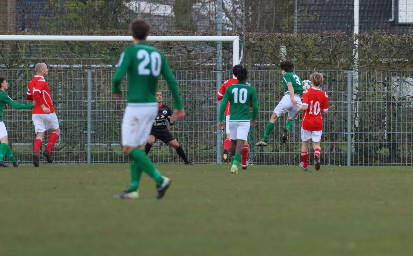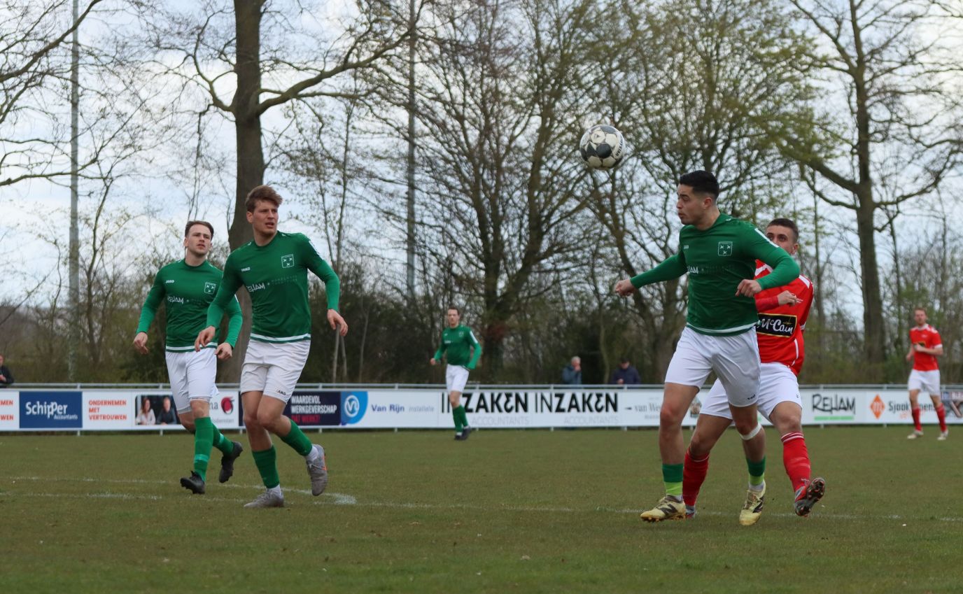 Met nog ruim twintig minuten op de klok moesten onze groen-witten risico gaan nemen. Ze schakelden over op één op één verdedigen en Arno Scheele schoof op naar voren. Zijn voorzet leverde een kleine twintig minuten voor het verstrijken van de officiële speeltijd bijna de gelijkmaker op. Lars de Jonge dook op bij de tweede paal, maar kopte in kansrijke positie ruim naast het doel van Dillian Vink.