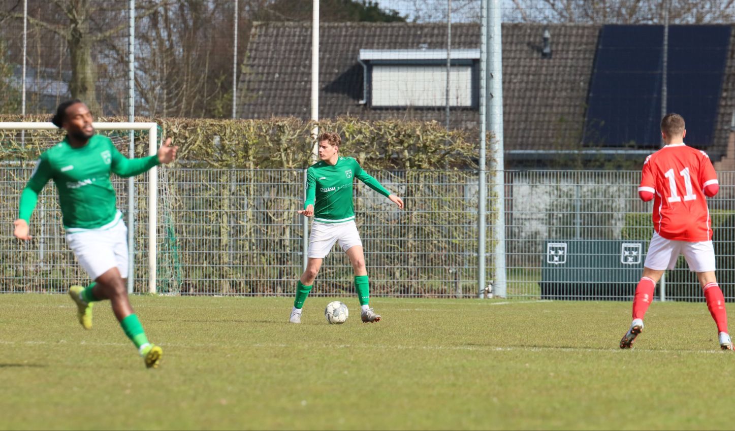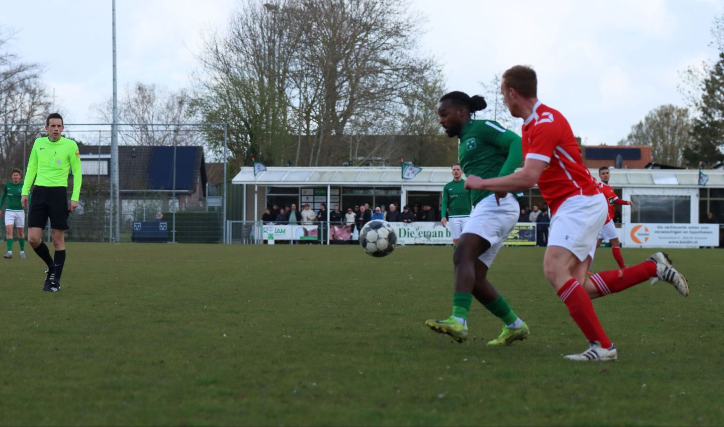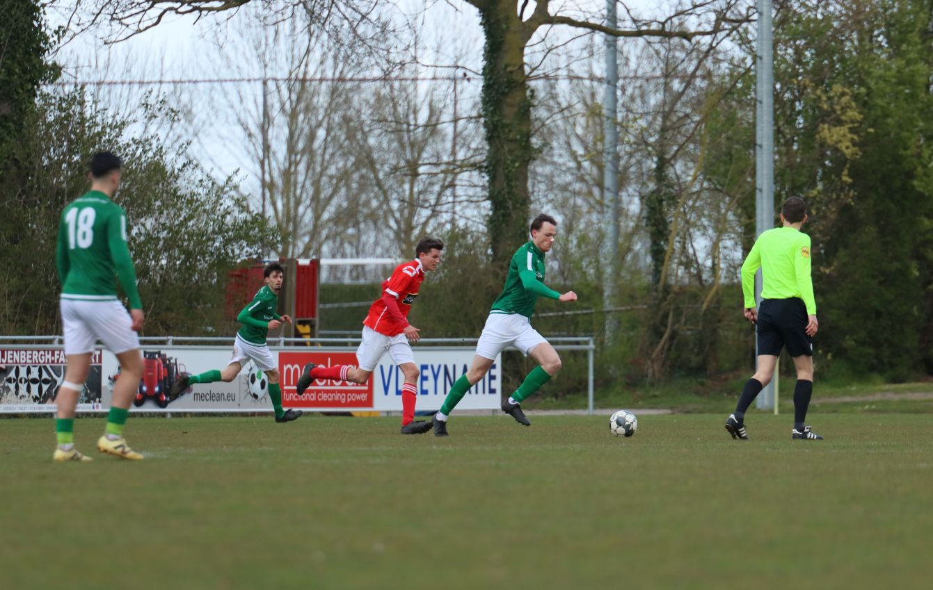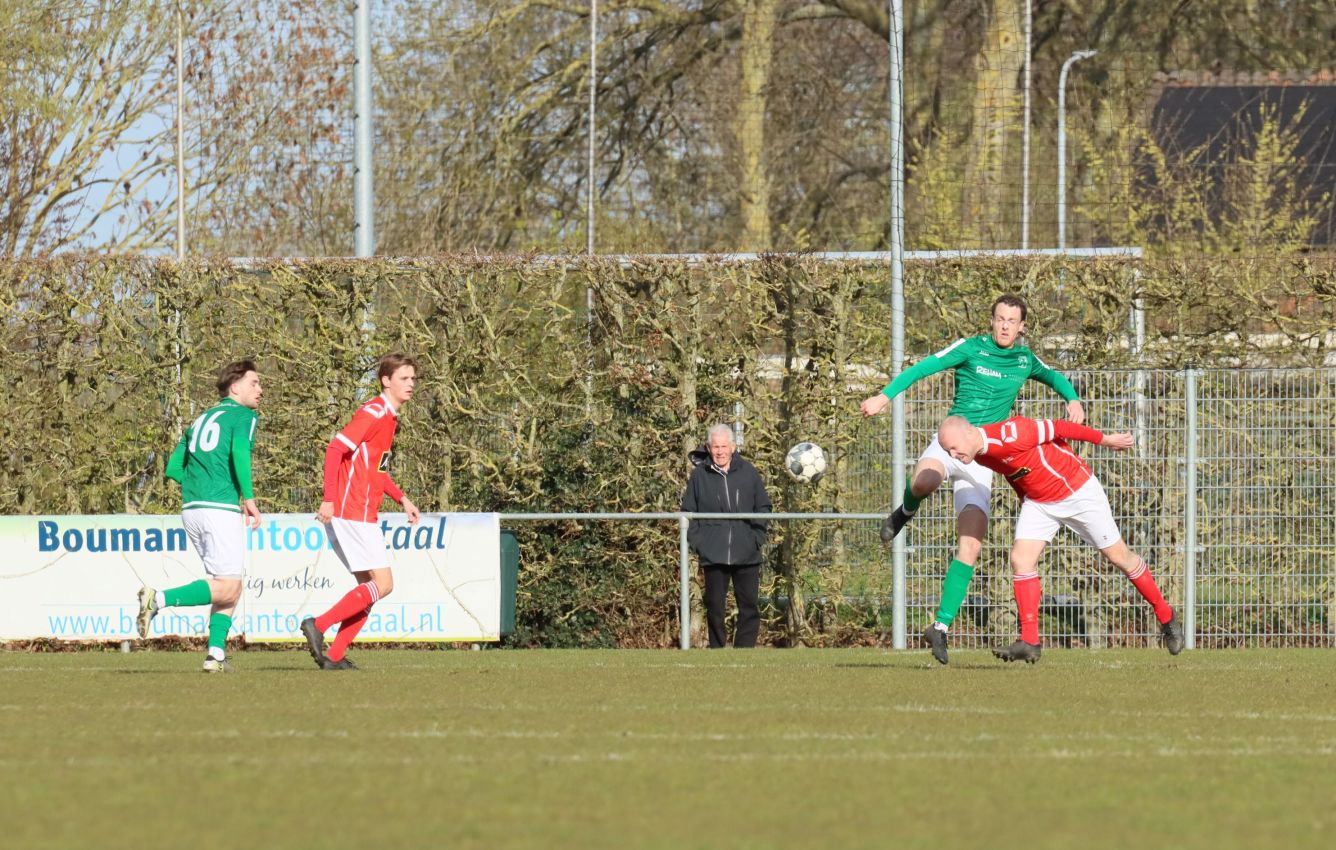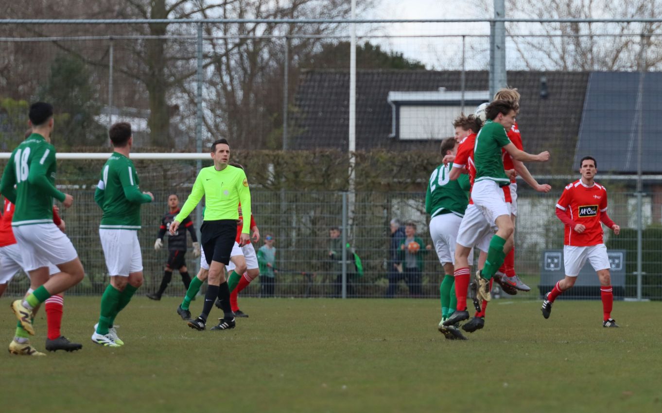 Met nog ruim twintig minuten op de klok moesten onze groen-witten risico gaan nemen. Ze schakelden over op één op één verdedigen en Arno Scheele schoof op naar voren. Zijn voorzet leverde een kleine twintig minuten voor het verstrijken van de officiële speeltijd bijna de gelijkmaker op. Lars de Jonge dook op bij de tweede paal, maar kopte in kansrijke positie ruim naast het doel van Dillian Vink.