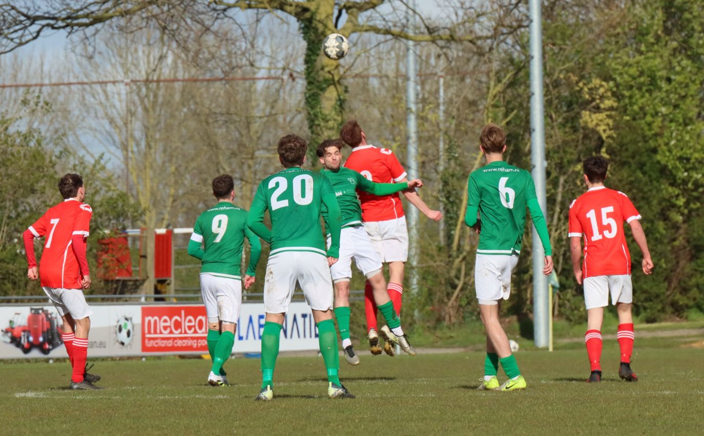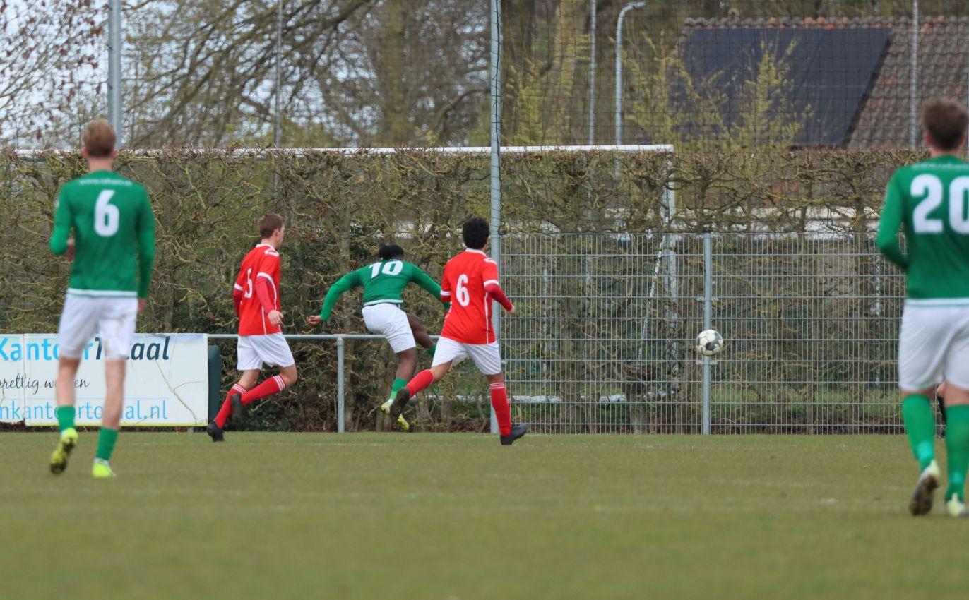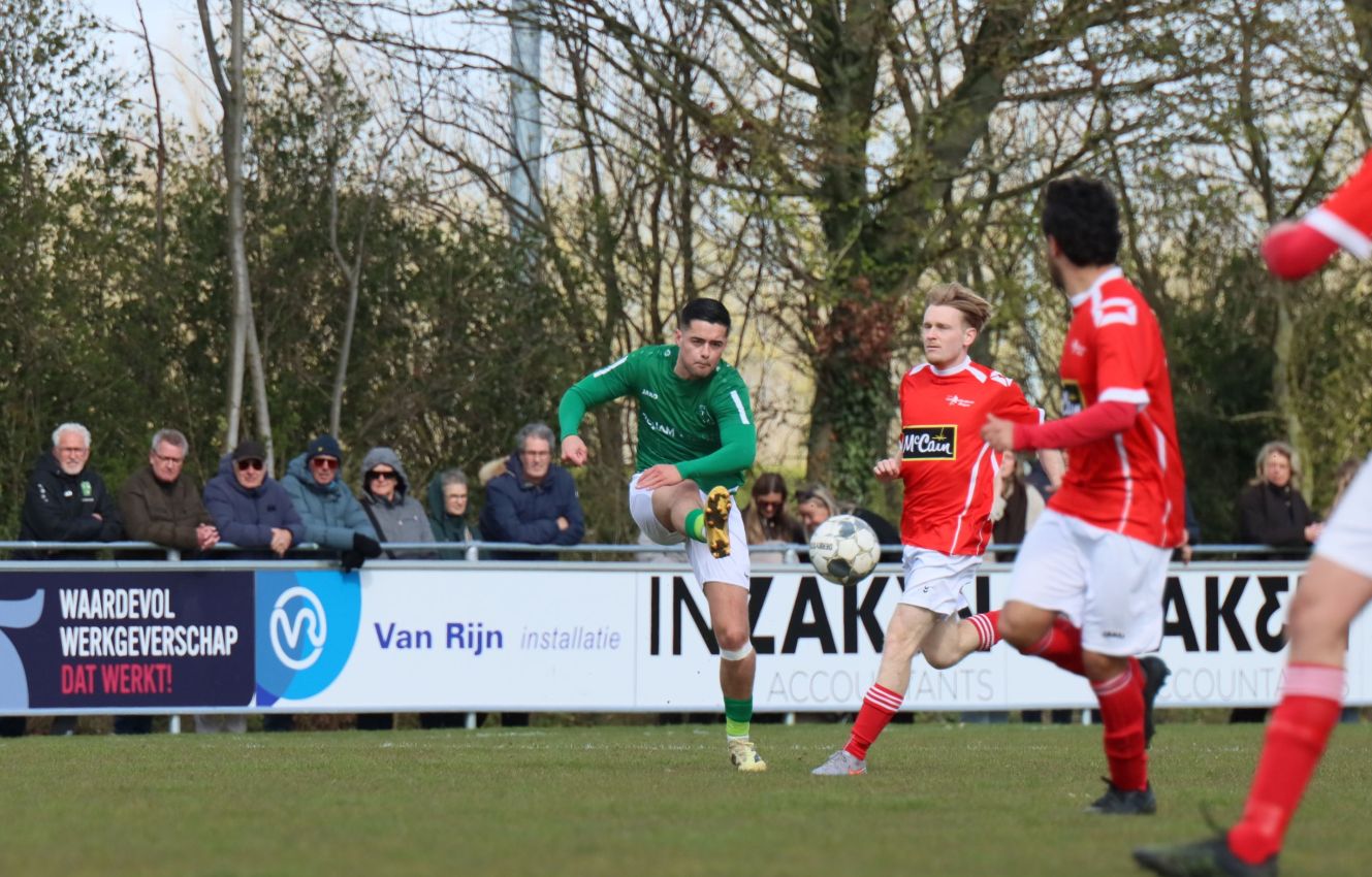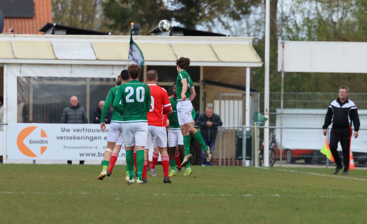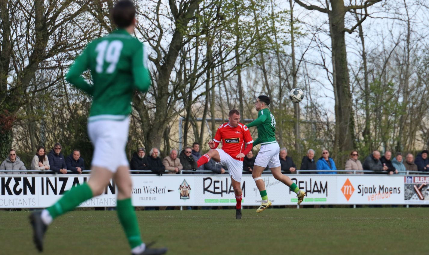 Met nog ruim twintig minuten op de klok moesten onze groen-witten risico gaan nemen. Ze schakelden over op één op één verdedigen en Arno Scheele schoof op naar voren. Zijn voorzet leverde een kleine twintig minuten voor het verstrijken van de officiële speeltijd bijna de gelijkmaker op. Lars de Jonge dook op bij de tweede paal, maar kopte in kansrijke positie ruim naast het doel van Dillian Vink.
