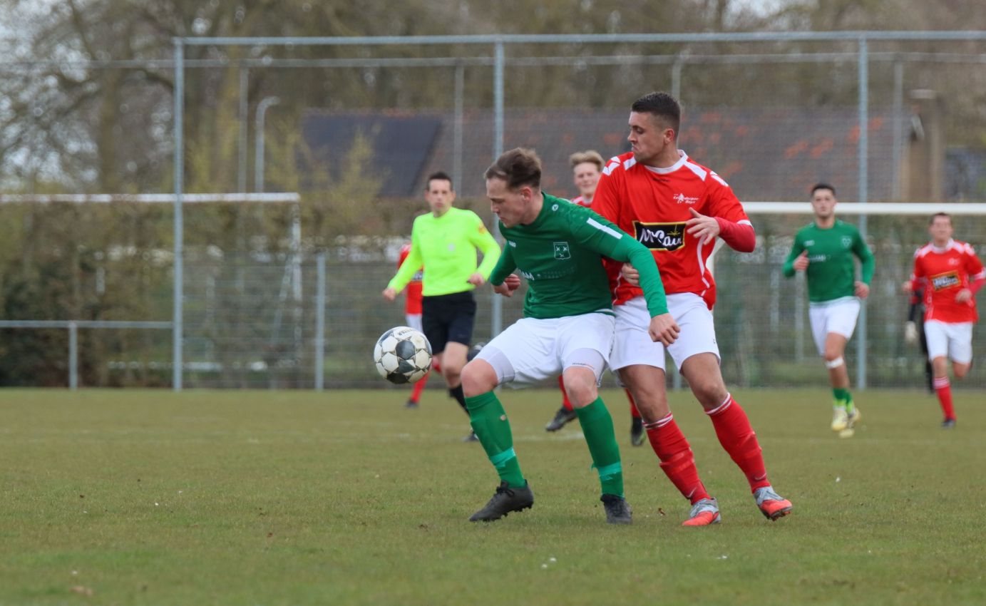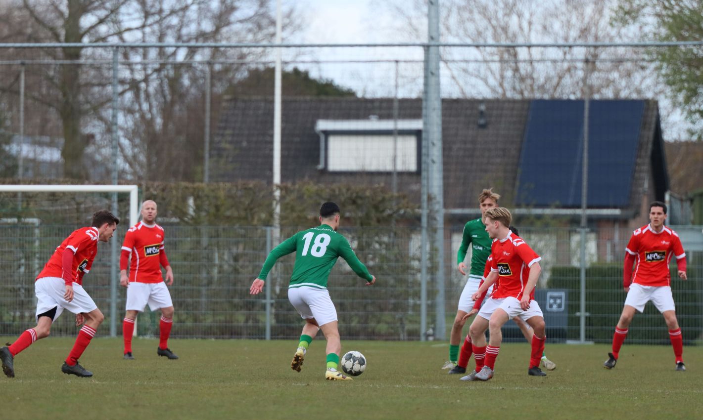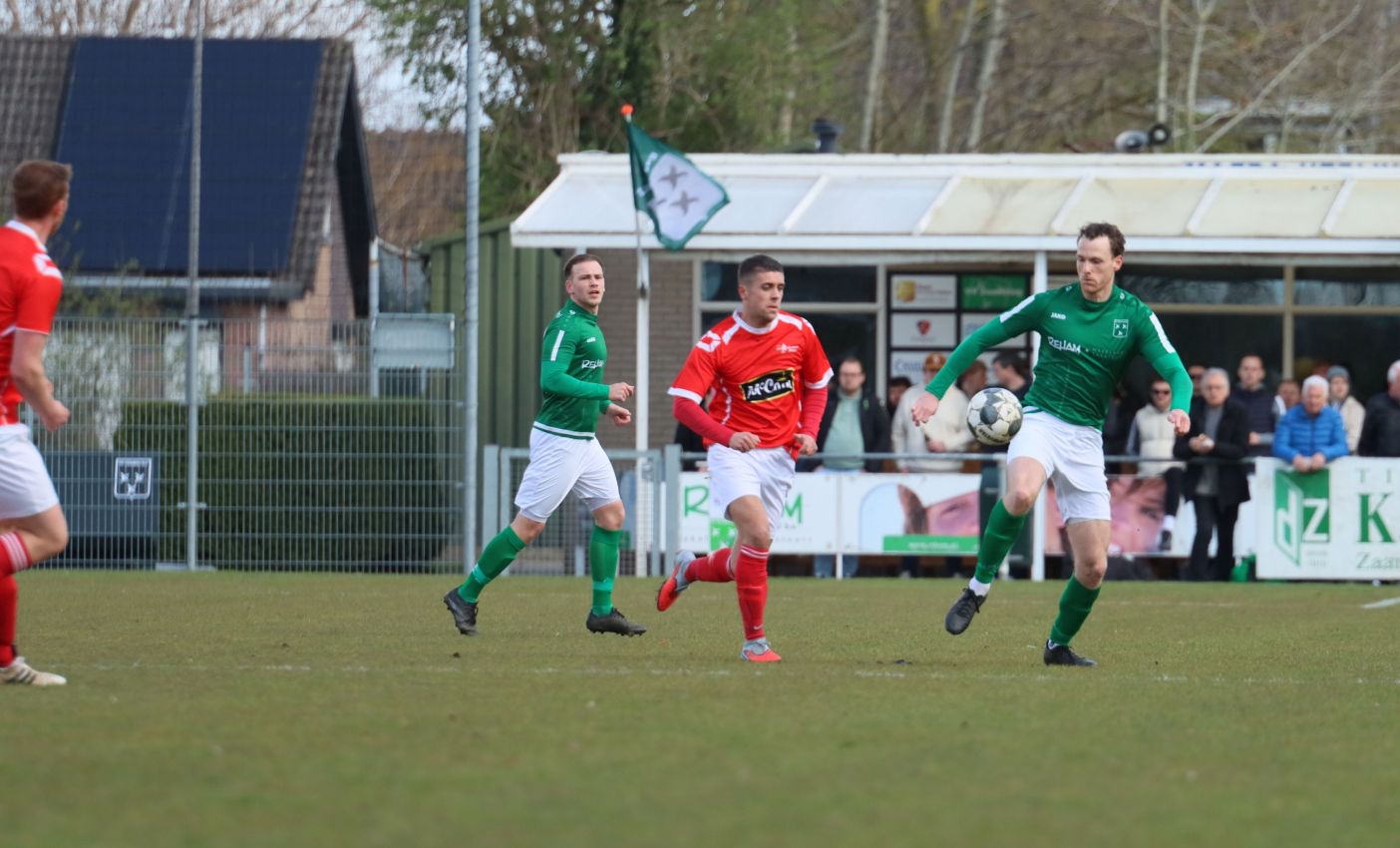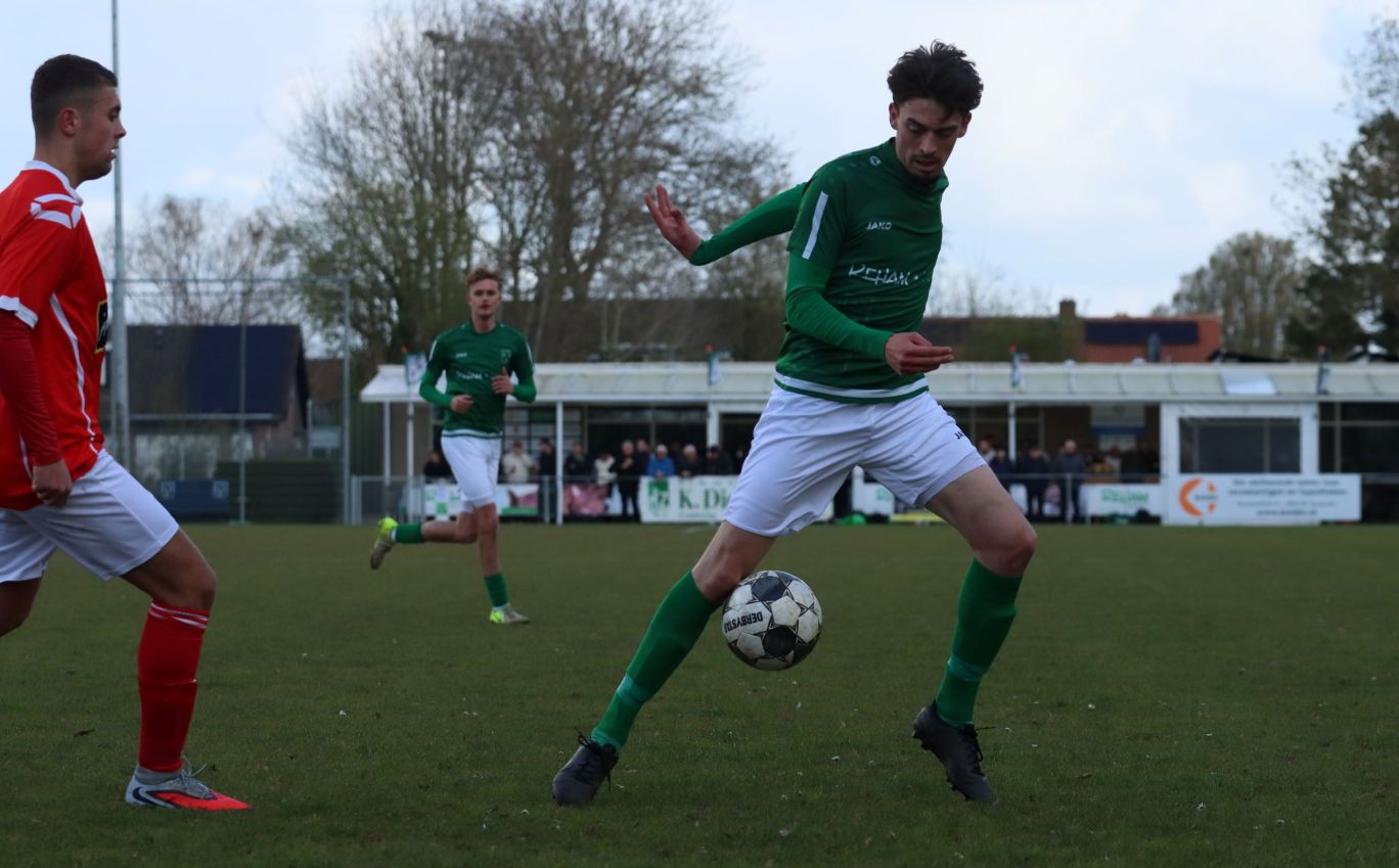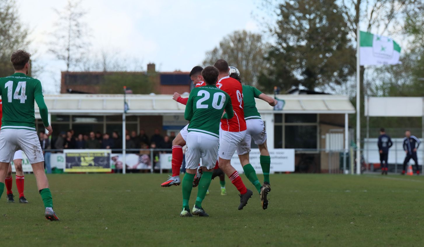 Met nog ruim twintig minuten op de klok moesten onze groen-witten risico gaan nemen. Ze schakelden over op één op één verdedigen en Arno Scheele schoof op naar voren. Zijn voorzet leverde een kleine twintig minuten voor het verstrijken van de officiële speeltijd bijna de gelijkmaker op. Lars de Jonge dook op bij de tweede paal, maar kopte in kansrijke positie ruim naast het doel van Dillian Vink.