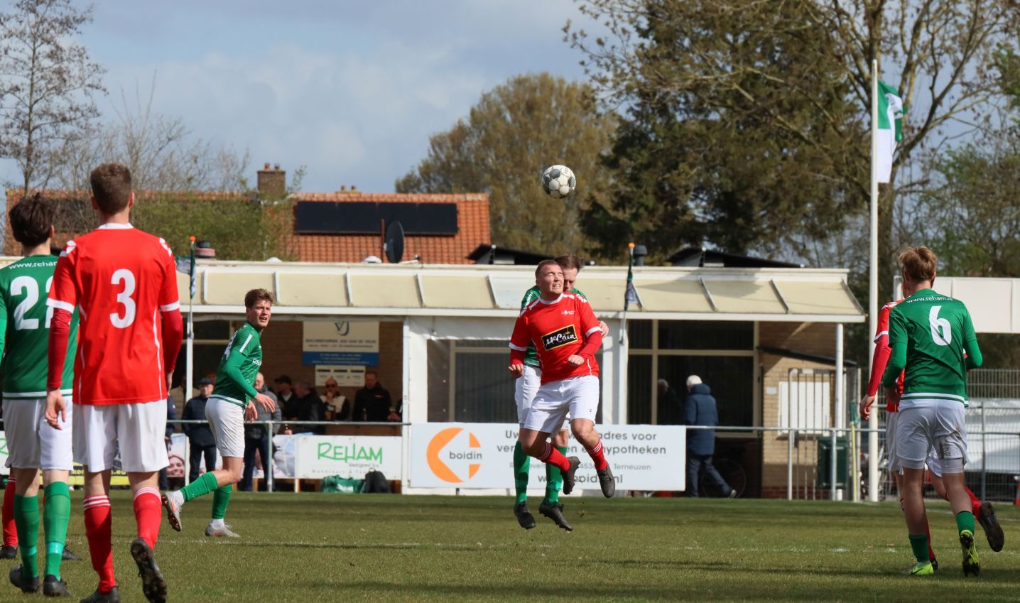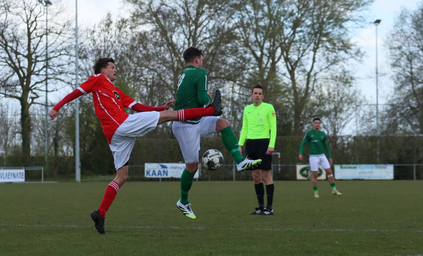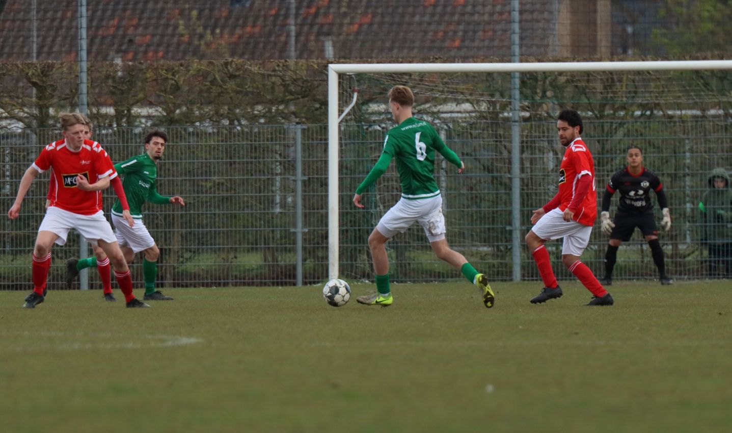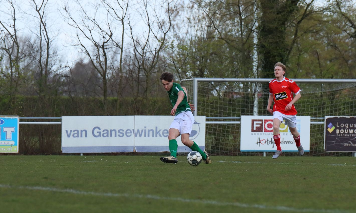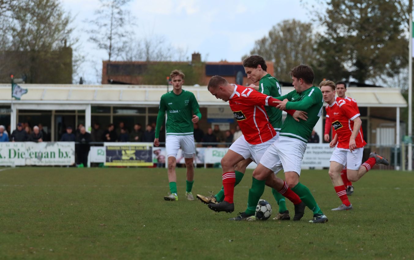 Met nog ruim twintig minuten op de klok moesten onze groen-witten risico gaan nemen. Ze schakelden over op één op één verdedigen en Arno Scheele schoof op naar voren. Zijn voorzet leverde een kleine twintig minuten voor het verstrijken van de officiële speeltijd bijna de gelijkmaker op. Lars de Jonge dook op bij de tweede paal, maar kopte in kansrijke positie ruim naast het doel van Dillian Vink.