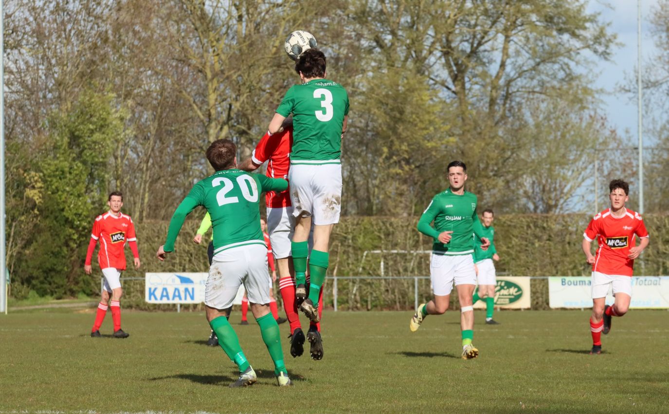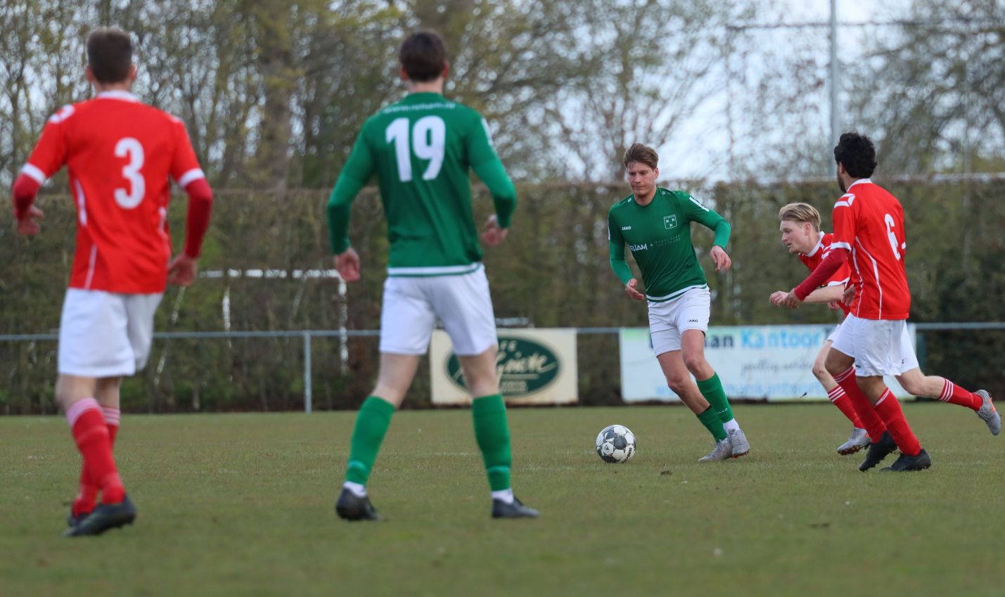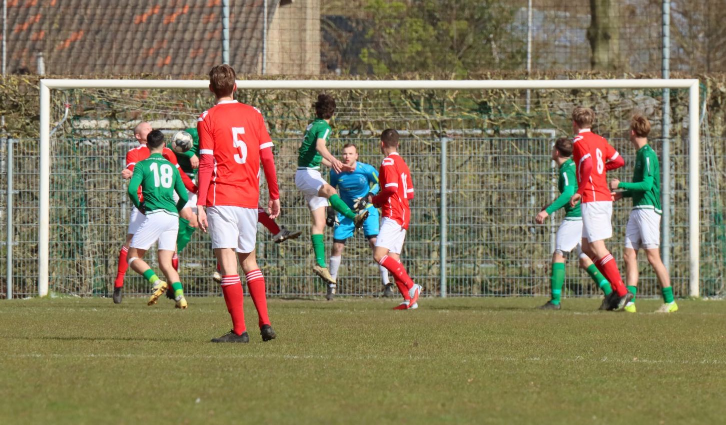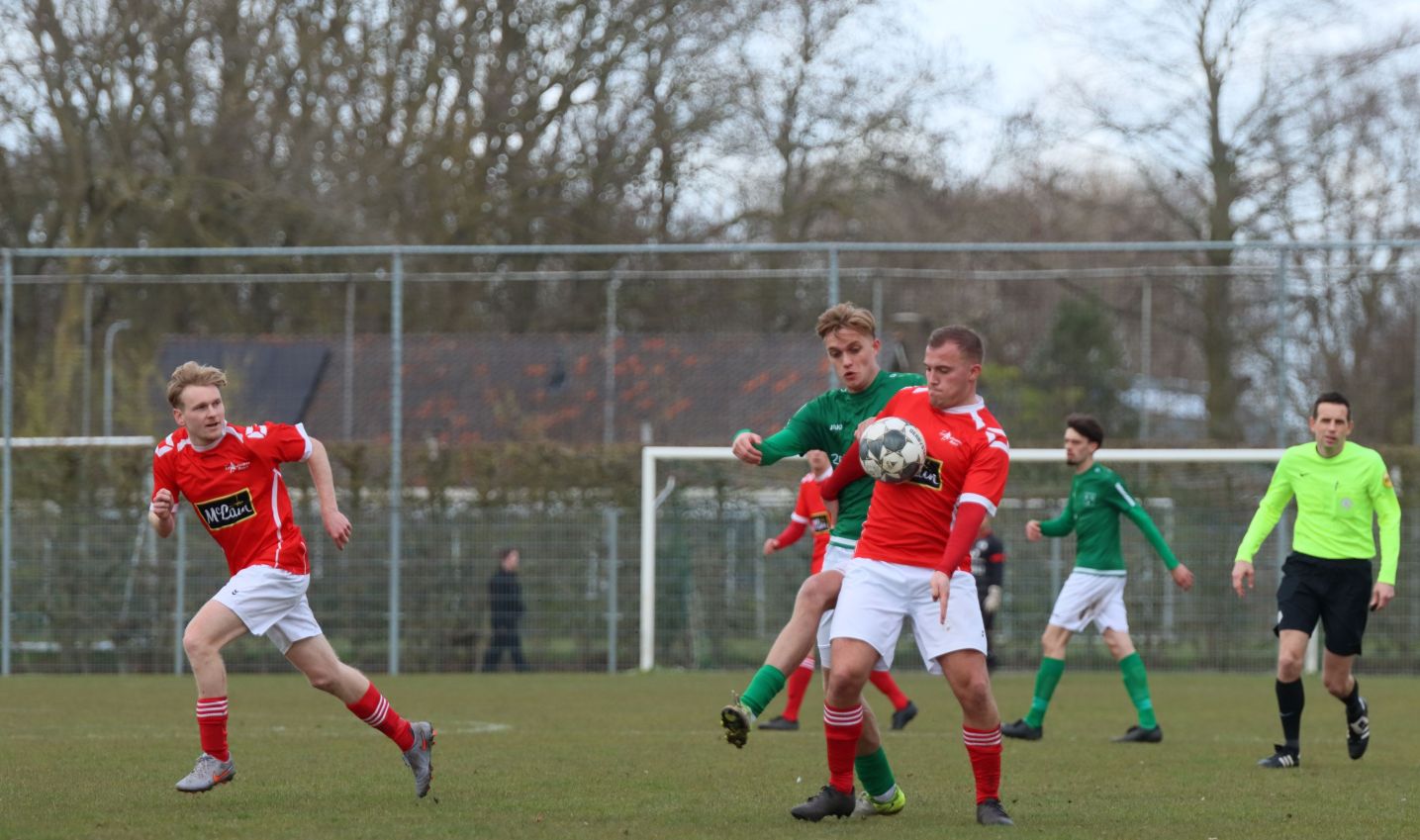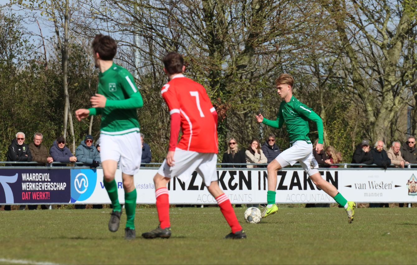 Met nog ruim twintig minuten op de klok moesten onze groen-witten risico gaan nemen. Ze schakelden over op één op één verdedigen en Arno Scheele schoof op naar voren. Zijn voorzet leverde een kleine twintig minuten voor het verstrijken van de officiële speeltijd bijna de gelijkmaker op. Lars de Jonge dook op bij de tweede paal, maar kopte in kansrijke positie ruim naast het doel van Dillian Vink.