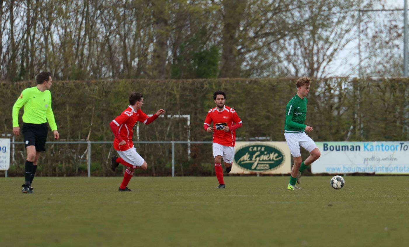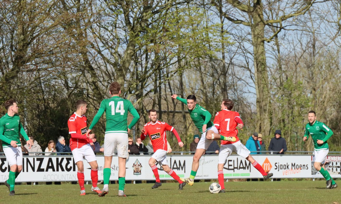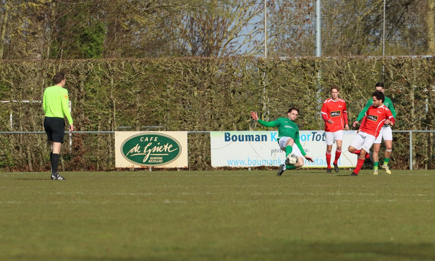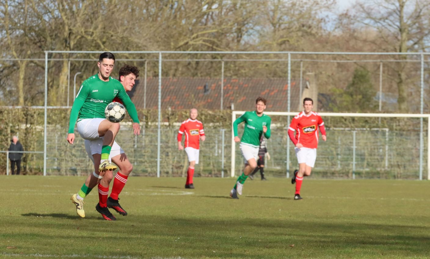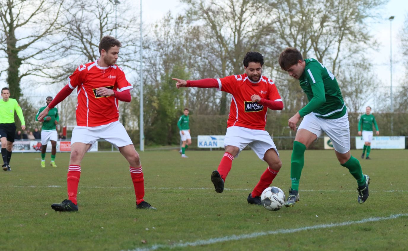 Met nog ruim twintig minuten op de klok moesten onze groen-witten risico gaan nemen. Ze schakelden over op één op één verdedigen en Arno Scheele schoof op naar voren. Zijn voorzet leverde een kleine twintig minuten voor het verstrijken van de officiële speeltijd bijna de gelijkmaker op. Lars de Jonge dook op bij de tweede paal, maar kopte in kansrijke positie ruim naast het doel van Dillian Vink.