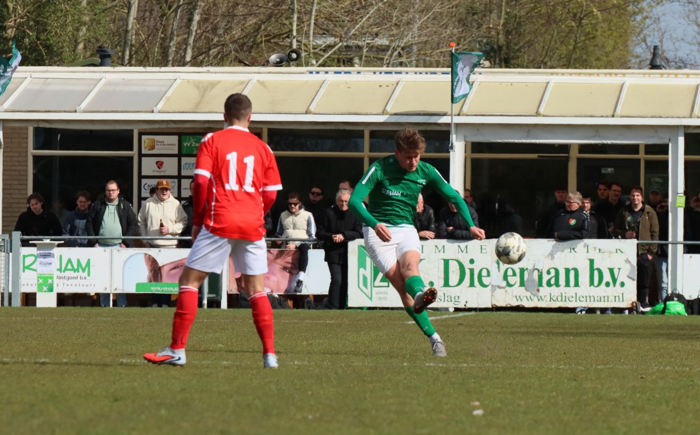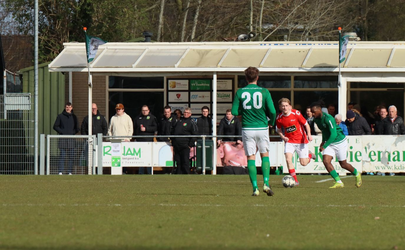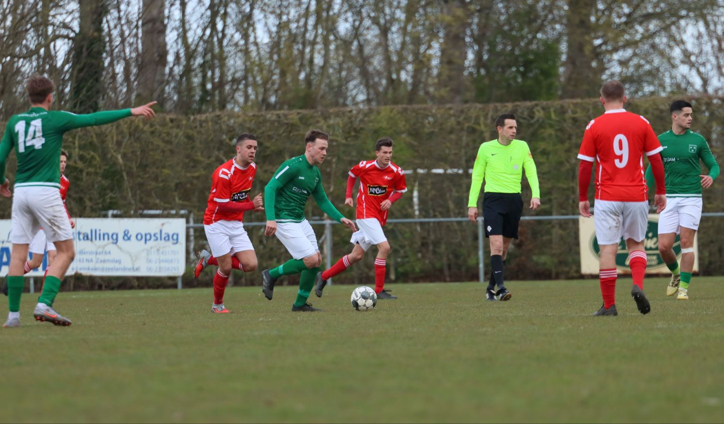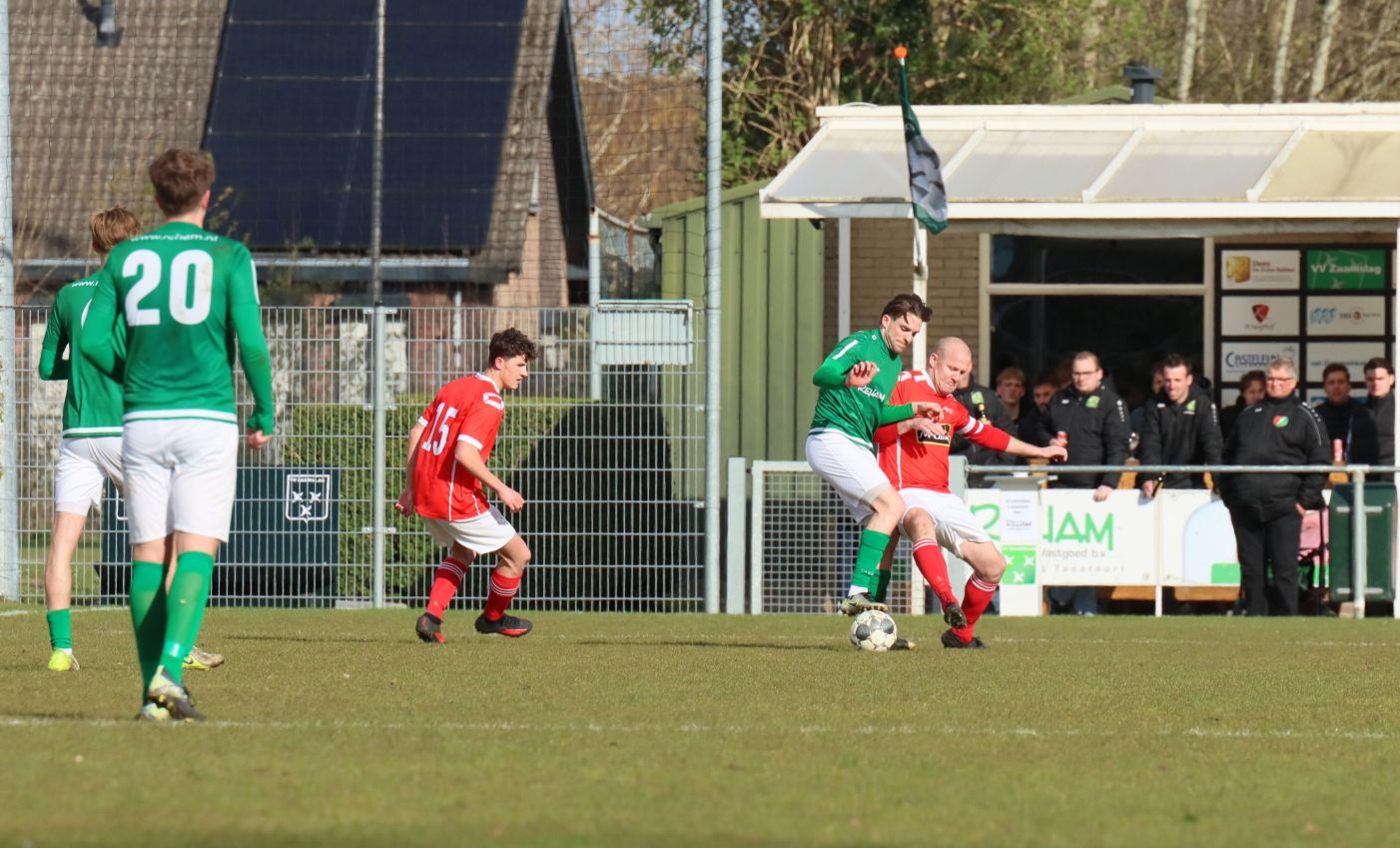 Onze groen-witten moesten duidelijk even bijkomen van de onverwachte tegenslag. In de daaropvolgende minuten lieten ze zich even aftroeven door de bezoekers, die twee minuten na de openingstreffer doelman Dominique Pijpelink onder vuur namen. De Zaamslag goalie keerde de inzet met stijl en voorkwam verdere schade. De opleving van de bezoekers was van korte duur. Nog voor het rustsignaal was er een alleraardigste mogelijkheid voor Koen Post, die na zijn blessure weer in de basis stond. Na een overtreding op Wout Hamelink kwam de bal bij de Zaamslag aanvoerder. Scheidsrechter Driesse floot niet, maar paste de voordeelregel toe. De inzet van Koen Post verdween echter rakelings voorlangs het doel van sluitpost Dillian Vink. Nadat even later het rustsignaal had geklonken begaven beide ploegen zich richting kleedkamer voor de thee en nieuwe instructies.