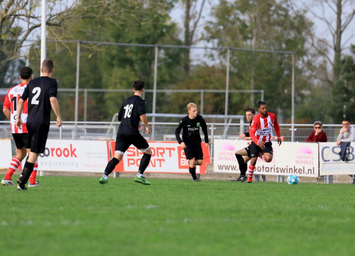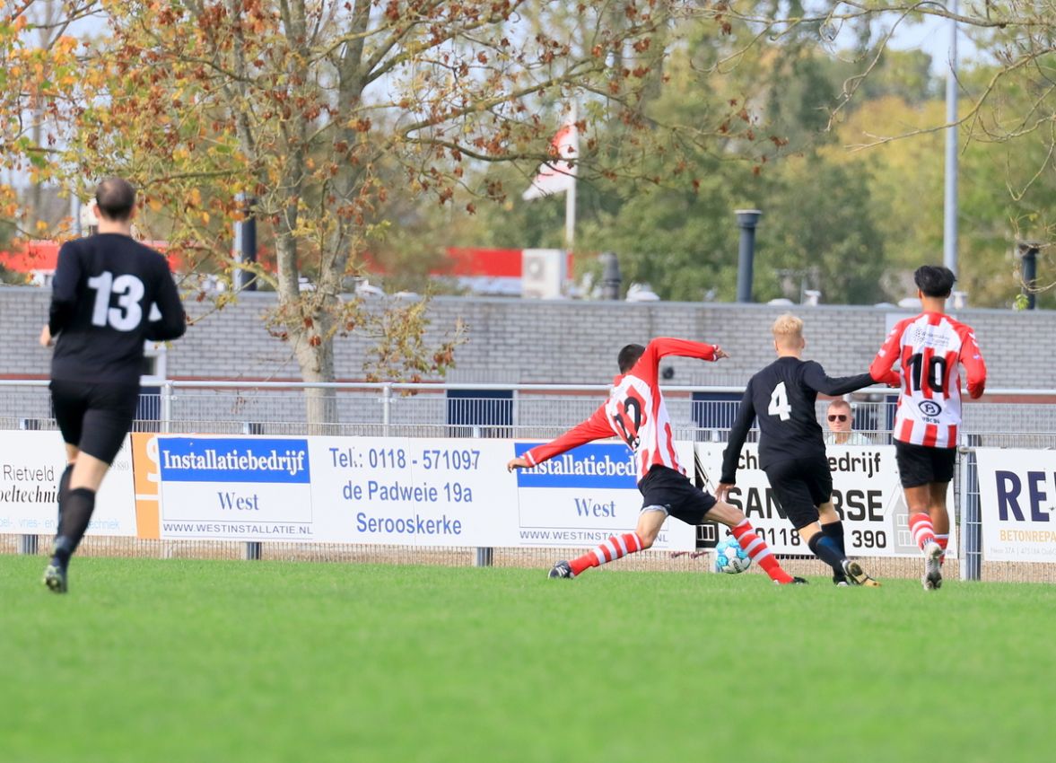 Na ruim tien minuten wedstrijd kwamen onze groen-witten voor het eerst aanvallend goed voor de dag. Nadat de mee opgekomen Marvin van der Staal het spel had verlegd van de linkerflank naar de rechterkant, was het Brian van Hoorn die de bal oppikte en uithaalde. Doelman Jeremy Koster leek geslagen, maar werd terzijde gestaan door de paal, die een openingsdoelpunt van de Zaamslag spits in de weg stond.