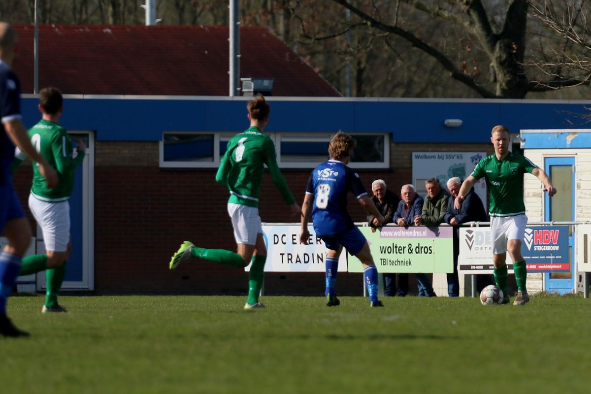 Zonder wissels te hebben doorgevoerd trapten onze groen-witten af voor de tweede 45 minuten. De thuisploeg kwam weer sterker voor de dag waarbij Davy van Nieuwenhuijzen al na vijf minuten dichtbij de openingstreffer was. Bryan Buren ging gestrekt naar de hoek, maar kreeg hulp van de paal. Amper twee minuten na het schot op de paal produceerden onze groen-witten (pas) hun eerste goede aanval van de wedstrijd. De bal kwam op links terecht bij Brian van Hoorn, die voorgaf op Wout Hamelink. De spits stond zowaar alleen voor doelman Luuk van Gilst en leek de hoek voor het uitkiezen te hebben. Het schot met zijn chocoladebeen ging recht op de doelman af, die met de voet kon keren. Het was de allereerste kans van de wedstrijd voor onze groen-witten en waarschijnlijk de grootste kans van de wedstrijd. Na dit gevaarlijke moment was het weer de beurt aan de thuisploeg. Aanval na aanval volgde en voor onze groen-witten was het vooral tegenhouden. Diverse ingrepen van doelman Bryan Buren waren vereist, waarmee hij zijn ploeg in de wedstrijd hield. Wat SSV’65 ook probeerde, ze wisten het net niet te vinden. Het leek echter een kwestie van tijd. Bryan Buren schreeuwde de longen uit zijn lijf om zijn verdediging vooruit te dirigeren, zover mogelijk weg van zijn doel. Het bleef billenknijpen tot het laatste fluitsignaal van scheidsrechter van Drunen. Onze groen-witten stonden in de slotfase onder zware druk en waren nauwelijks in staat om te counteren. Dat lukte slechts één keer toen Teun van Fraeijenhove tien minuten voor tijd Wout Hamelink diep stuurde. De spits trof onderweg doelman Luuk van Gilst op zijn pad, die de veelbelovende aanval onderbrak. De SSV doelman had weinig te doen gehad, maar onderscheidde zich toch met een paar fraaie ingrepen op beslissende momenten. Uiteindelijk lukte het SSV’65 niet om de wedstrijd naar zich toe te trekken en stond ook na het laatste fluitsignaal nog steeds de brillenstand op het scorebord.