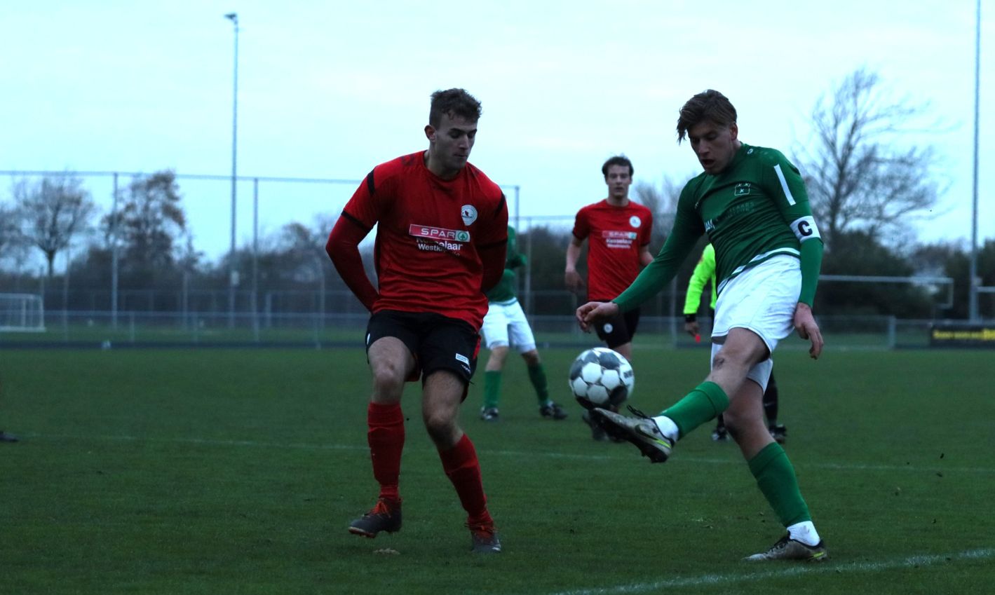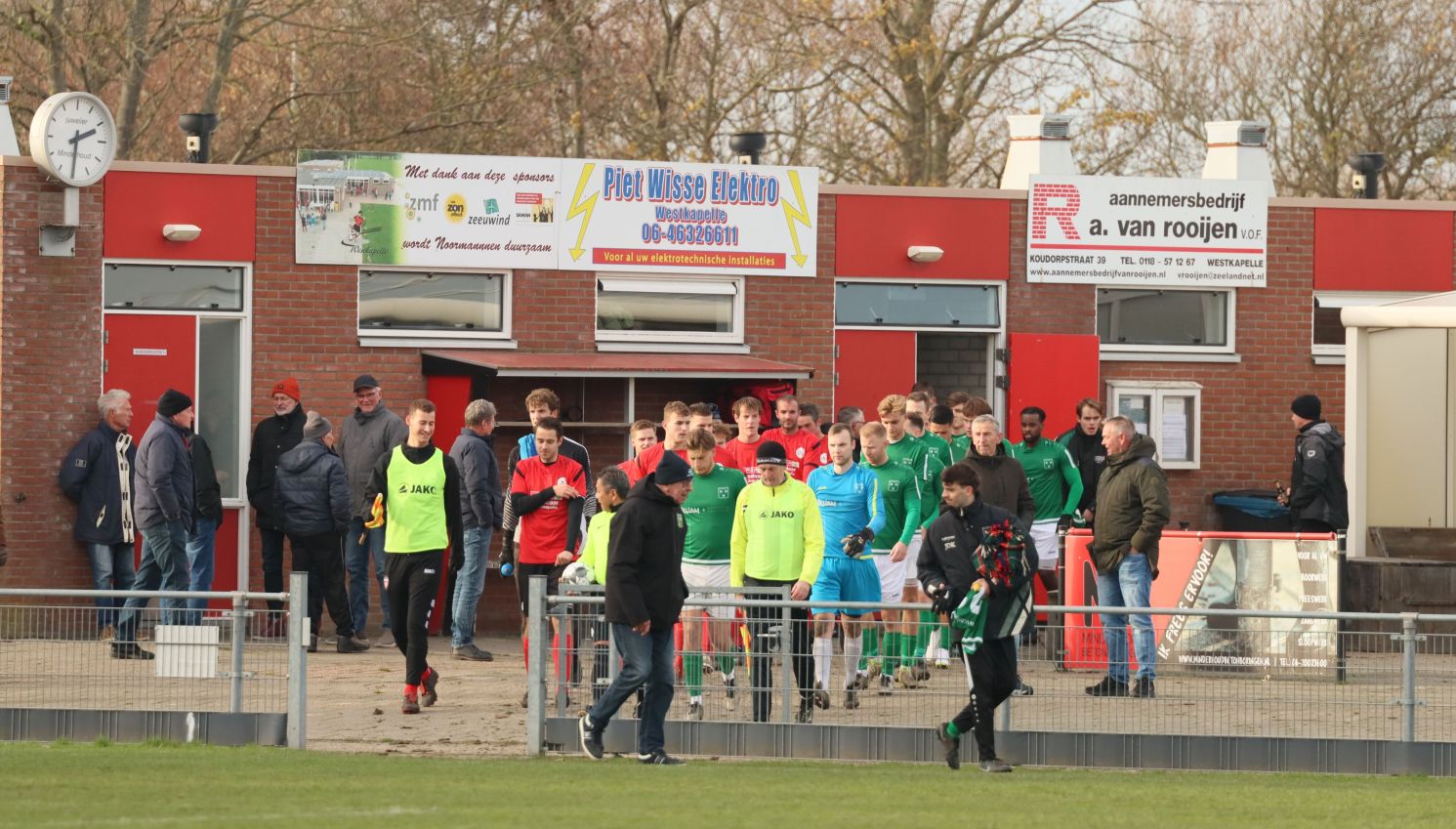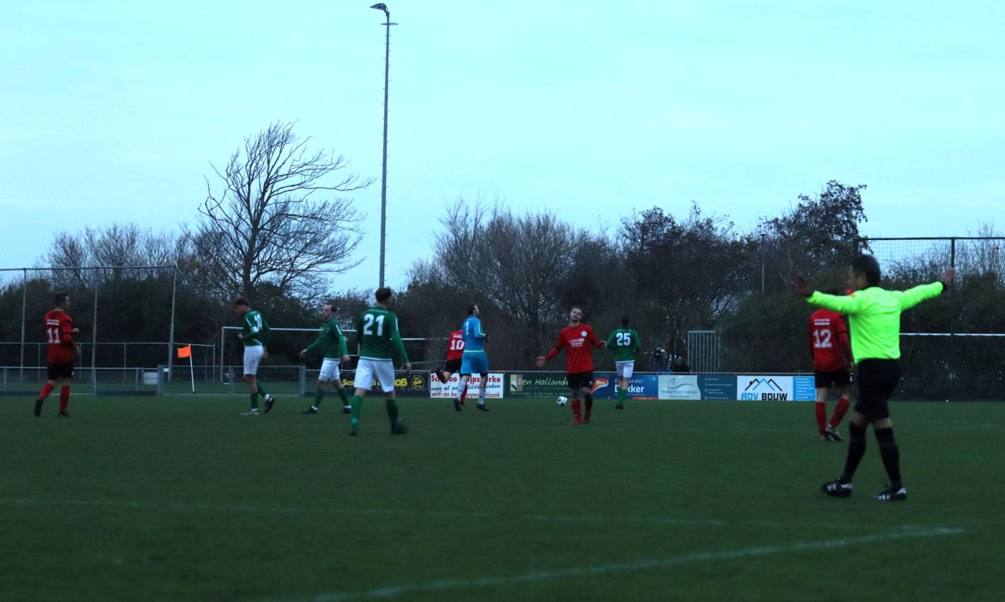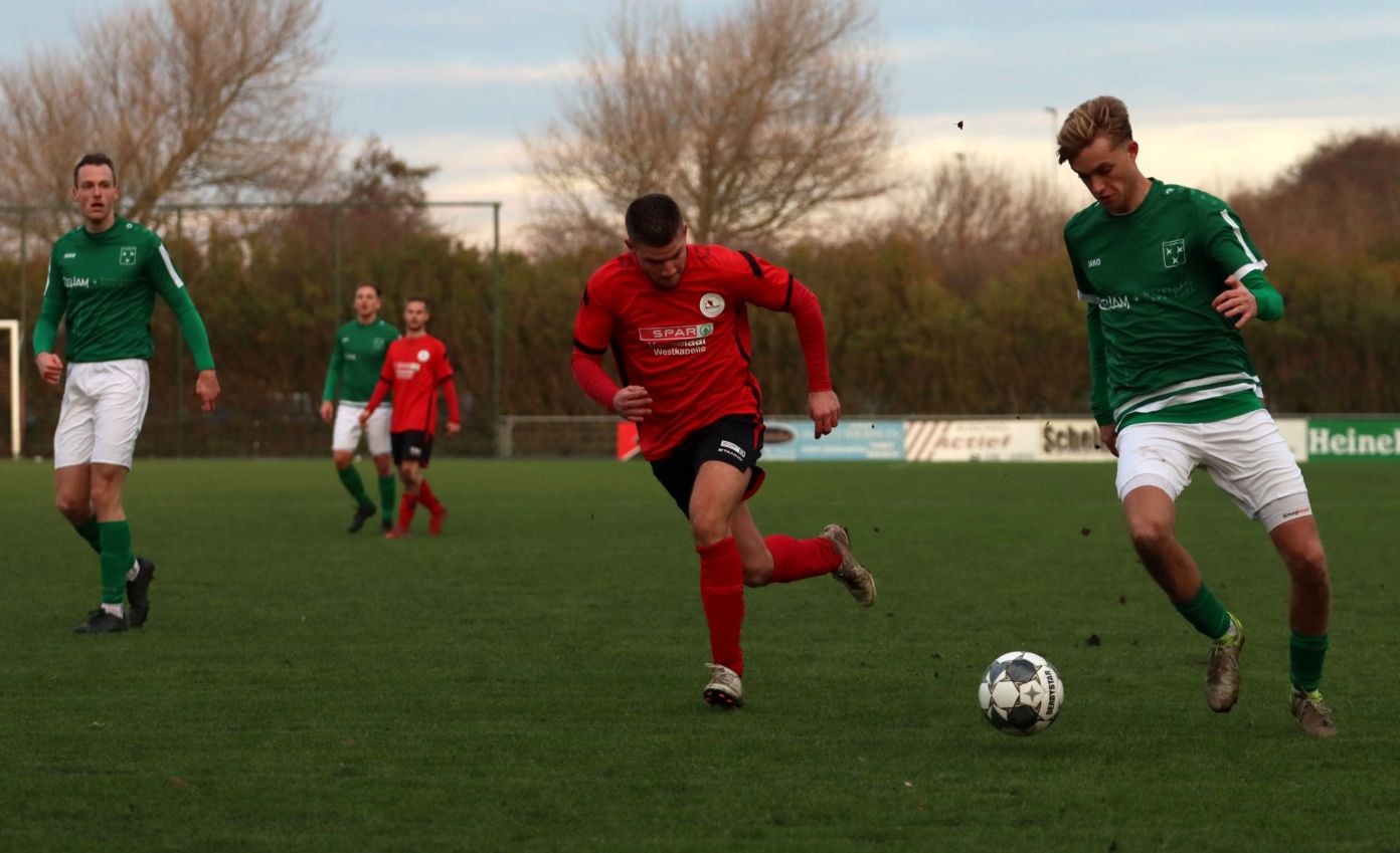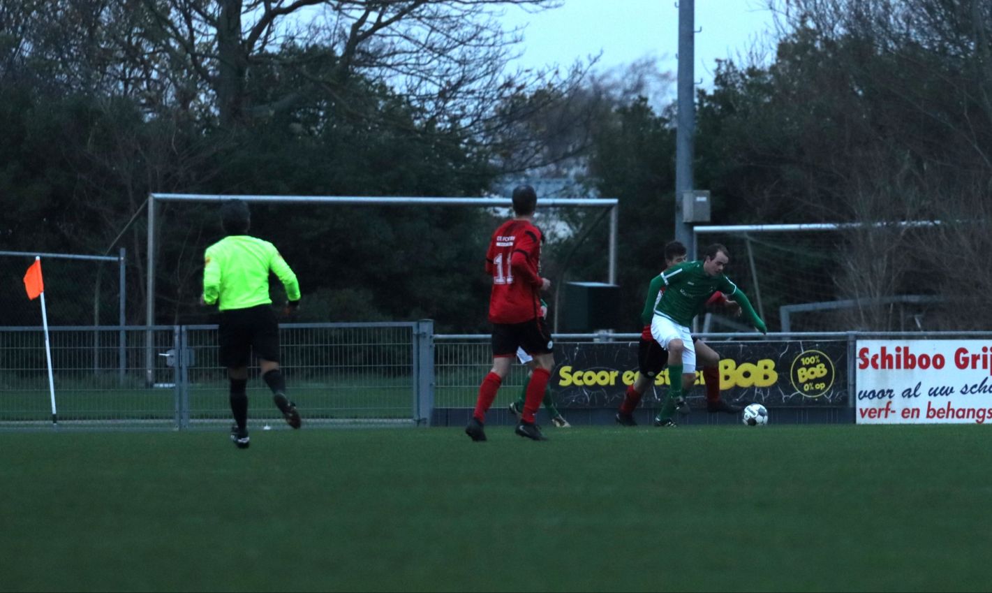 De temperatuur was een paar graden boven nul in Westkapelle, maar de gevoelstemperatuur was rond het vriespunt of zelfs iets daaronder. Langs de lijn was het dus behoorlijk koud, maar voor de hoofdrolspelers van de middag leken het prima omstandigheden. Beide ploegen bleken aan elkaar gewaagd op het zware en lastig te bespelen veld. Ze maakten er een intense wedstrijd van met veel strijd, ondanks dat het voetbal lang niet altijd goed was. In ieder geval was het spel van onze groen-witten ondermaats. De thuisploeg daarentegen speelde volgens elftalleider Peter Willeboordse haar beste wedstrijd van deze competitie. Als gevolg van het vele balverlies over en weer golfde het spel op en neer. Grote kansen waren er aanvankelijk niet of nauwelijks. Eén van de spaarzame mogelijkheden voor onze groen-witten was na vijf minuten voor Jeffrey van de Velde. Hij kreeg de bal doorgekopt van Wout Hamelink. Zijn aanname was niet optimaal, waardoor zijn inzet via een verdediger over de achterlijn verdween. Halverwege het eerste bedrijf lanceerde Cees van Tiel met een diepe bal Lars de Jonge. De voorzet die volgde werd eruit gehaald ten koste van een hoekschop. De corner werd door Michael Christina hoog voor het doel richting Cees van Tiel gebracht, maar die kwam niet aan koppen toe doordat een verdediger hem net voor was.