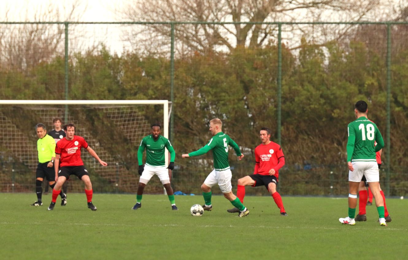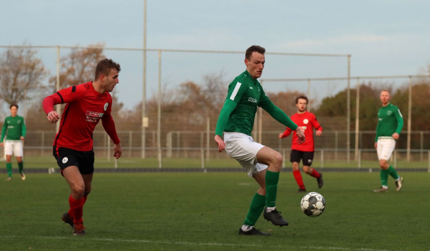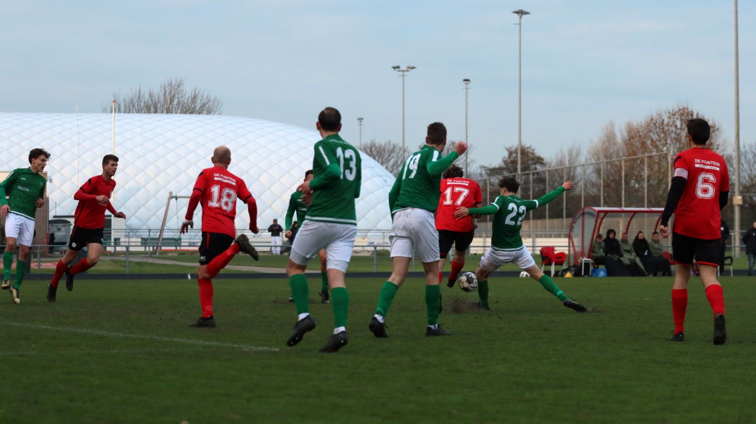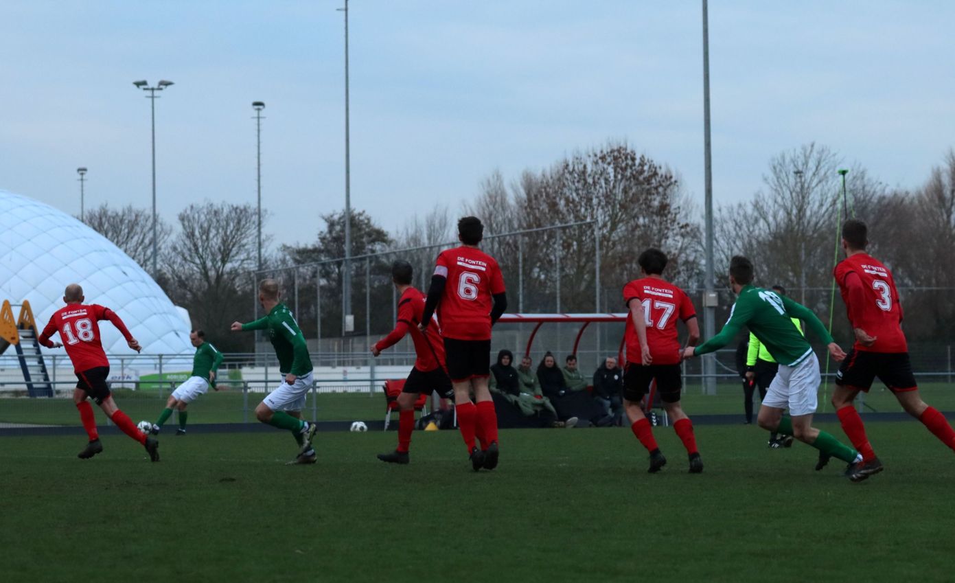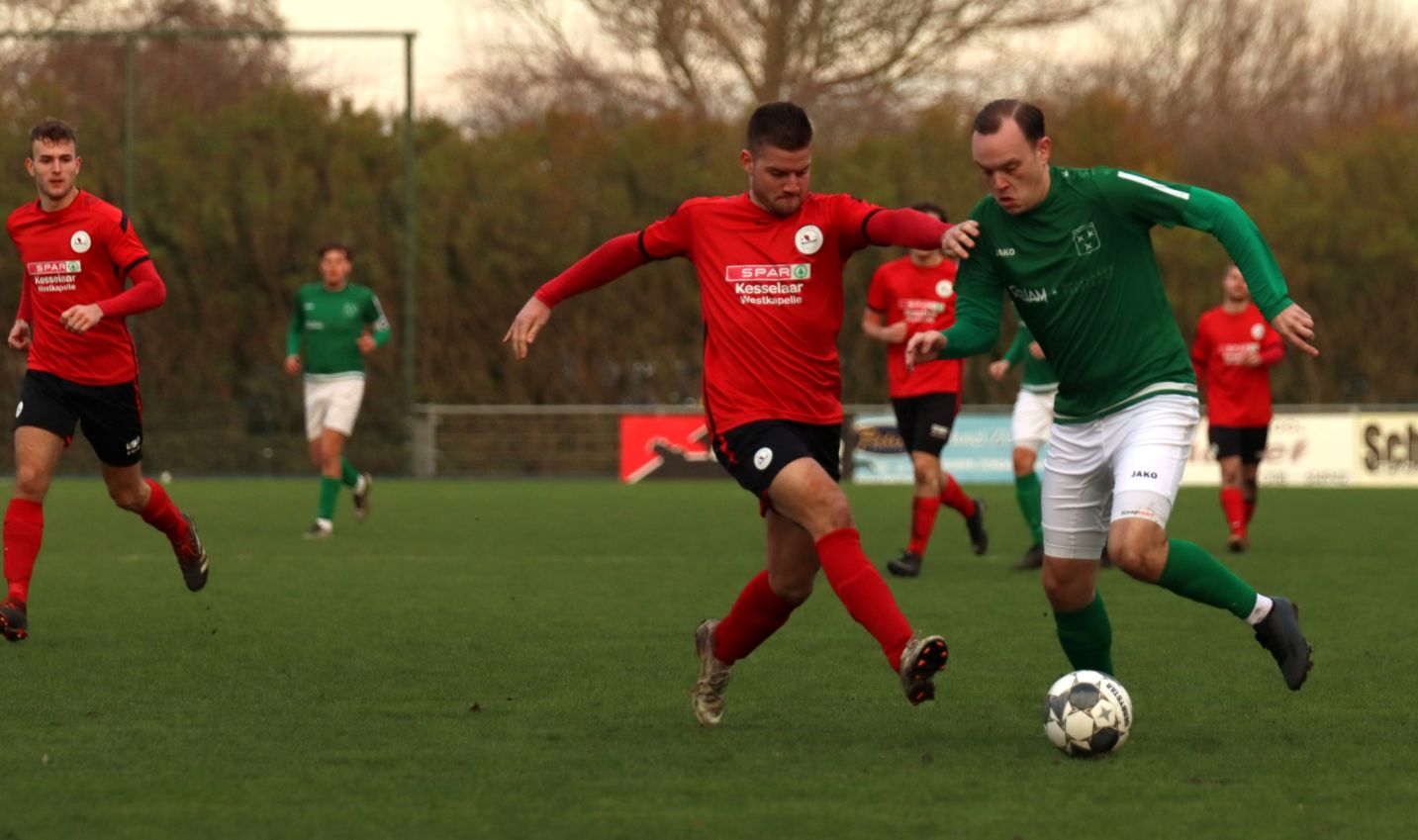 De temperatuur was een paar graden boven nul in Westkapelle, maar de gevoelstemperatuur was rond het vriespunt of zelfs iets daaronder. Langs de lijn was het dus behoorlijk koud, maar voor de hoofdrolspelers van de middag leken het prima omstandigheden. Beide ploegen bleken aan elkaar gewaagd op het zware en lastig te bespelen veld. Ze maakten er een intense wedstrijd van met veel strijd, ondanks dat het voetbal lang niet altijd goed was. In ieder geval was het spel van onze groen-witten ondermaats. De thuisploeg daarentegen speelde volgens elftalleider Peter Willeboordse haar beste wedstrijd van deze competitie. Als gevolg van het vele balverlies over en weer golfde het spel op en neer. Grote kansen waren er aanvankelijk niet of nauwelijks. Eén van de spaarzame mogelijkheden voor onze groen-witten was na vijf minuten voor Jeffrey van de Velde. Hij kreeg de bal doorgekopt van Wout Hamelink. Zijn aanname was niet optimaal, waardoor zijn inzet via een verdediger over de achterlijn verdween. Halverwege het eerste bedrijf lanceerde Cees van Tiel met een diepe bal Lars de Jonge. De voorzet die volgde werd eruit gehaald ten koste van een hoekschop. De corner werd door Michael Christina hoog voor het doel richting Cees van Tiel gebracht, maar die kwam niet aan koppen toe doordat een verdediger hem net voor was.