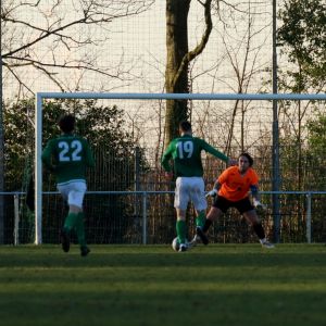 Mede dankzij goed verdedigend werk leek er met de comfortabele 2-0 voorsprong geen vuiltje aan de lucht. Nadat doelman Quinten Mel met een fraaie redding eerst nog een doelpunt had weten te voorkomen, ging het in de slotfase van de 1e helft toch nog mis. Balverlies op het middenveld luidde de aansluitingstreffer van Nieuwland in, dat snel was in de omschakeling en vanaf de rechterkant de lat trof boven doelman Quinten Mel, waarna de bal voor de voeten van Jonathan Constansia viel. De aanvaller wist wel raad met dit buitenkansje en tekende voor de aansluitingstreffer, ondanks een verwoede poging van Lars de Jonge om een treffer te voorkomen. Zo gingen onze groen-witten niet met een comfortabele 2-0 de rust in, maar met een minimale voorsprong van één doelpunt.