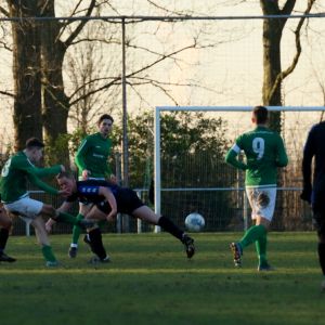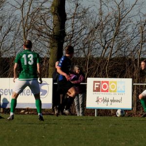 Na het eerste fluitsignaal van scheidsrechter Ben van Belzen uit Kapelle duurde het een tiental minuten voordat onze groen-witten op stoom kwamen. Na een gelijkopgaande strijd die zich voornamelijk op het middenveld afspeelde, trok de ploeg van Fabian Wilson het initiatief naar zich toe. De eerste doelpoging liet daarna dan ook niet lang op zich wachten. Binnen het kwartier nam Wout Hamelink het vijandelijke doel onder vuur, maar zijn vizier stond nog niet op scherp, waardoor hij zijn inzet hoog over het doel van Yoeri Nijsse zag verdwijnen. Er stond een zeer gemotiveerde en ploeg binnen de lijnen met maar één doel voor ogen, de competitie hervatten met een overwinning. De eerste aanzet daartoe werd gegeven in de 17e minuut na misschien wel de mooiste aanval van heel de wedstrijd. Via veel schijven kwam de bal van achteruit terecht bij Brian van Hoorn, die rechtsback Lars de Jonge diep stuurde. Diens voorzet werd door Michael Christina voor het doel op juiste waarde geschat, 1-0. Heel de Nieuwland verdediging, inclusief de doelman, stonden erbij en keken er naar.