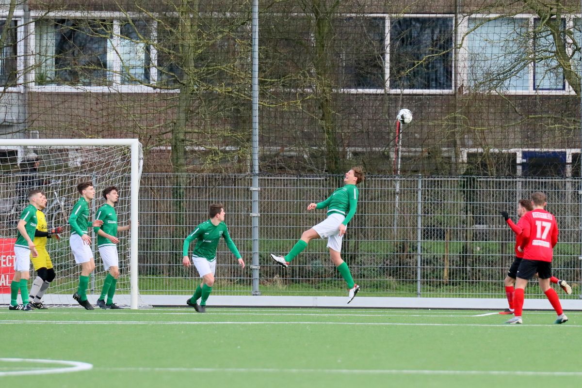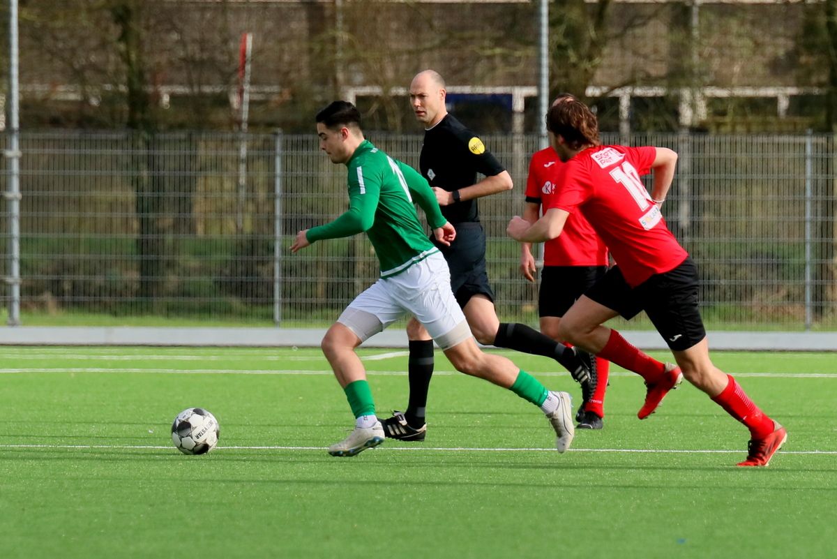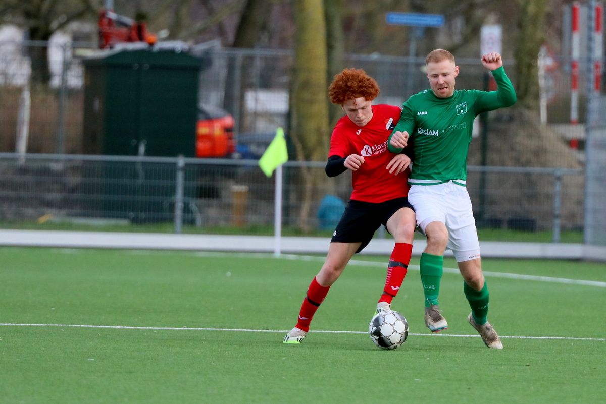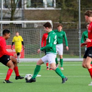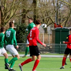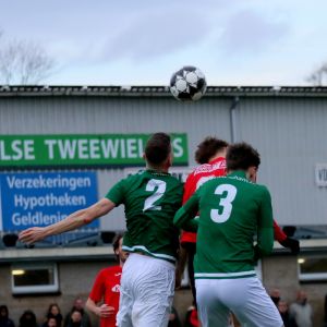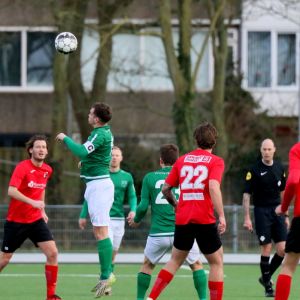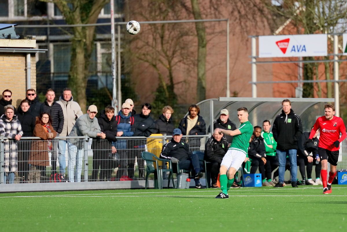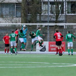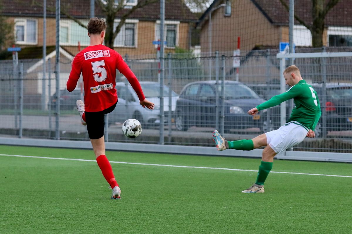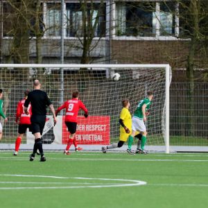 Onze groen-witten lieten zich dus niet onbetuigd, al ontsnapten ze twee minuten later aan een grotere achterstand. Een inzet van Nicky van Merrienboer leek langs doelman Bryan Buren in het doel te verdwijnen, maar dat werd op het laatste nippertje voorkomen door Arno Scheele, die met een uitstekende sliding de bal net voor de doellijn kon wegwerken ten koste van een hoekschop. Zo bleven onze groen-witten op de been en daarvoor beloonden ze zichzelf halverwege de 1e helft. Op aangeven van Wout Hamelink, die voor even was uitgeweken naar de rechterflank, trok Brian van Hoorn met een schitterende halve omhaal de stand weer gelijk. Een schoonheid van een doelpunt dat je niet zo vaak ziet op de velden.