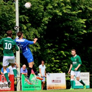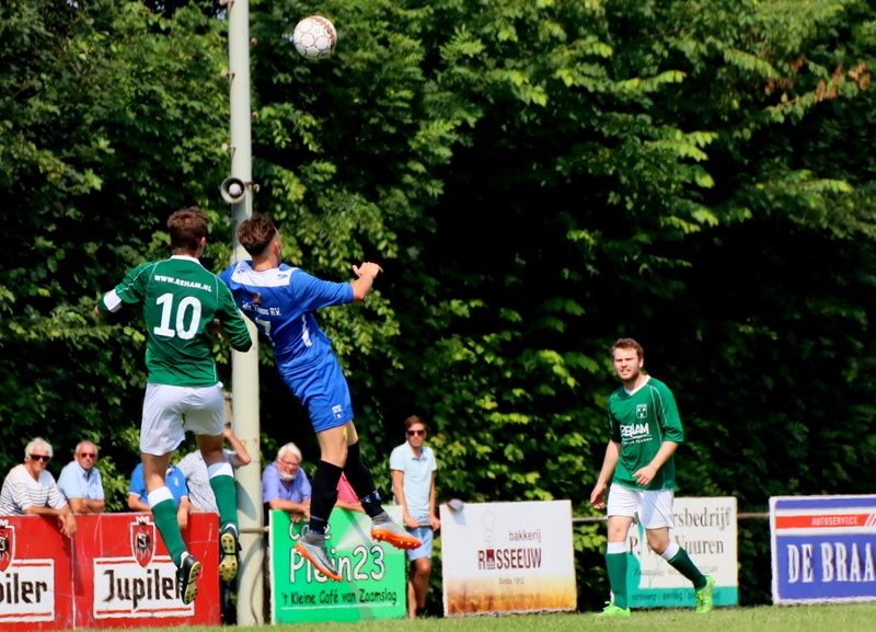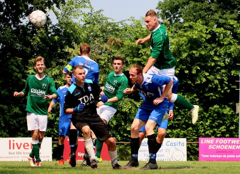 Binnen vijf minuten had de stand weer in evenwicht kunnen zijn als Wesley Dieleman een beetje meer geluk had gehad. Hij kopte uit een hoekschop van Juriën Dam snoeihard op de paal. Uit de daaropvolgende tegenaanval gaf de aalvlugge Mark van Agteren zijn visitekaartje af. Hij snelde over de linkerflank richting het Zaamslag doel en liet iedereen zijn hielen zien. Toen hij ook de uitkomende Dominique Pijpelink te snel af was, maakte hij het vervolgens knap af. Deze 0-2 kwam aan als een mokerslag, maar onze groen-witten gaven de moed niet op.