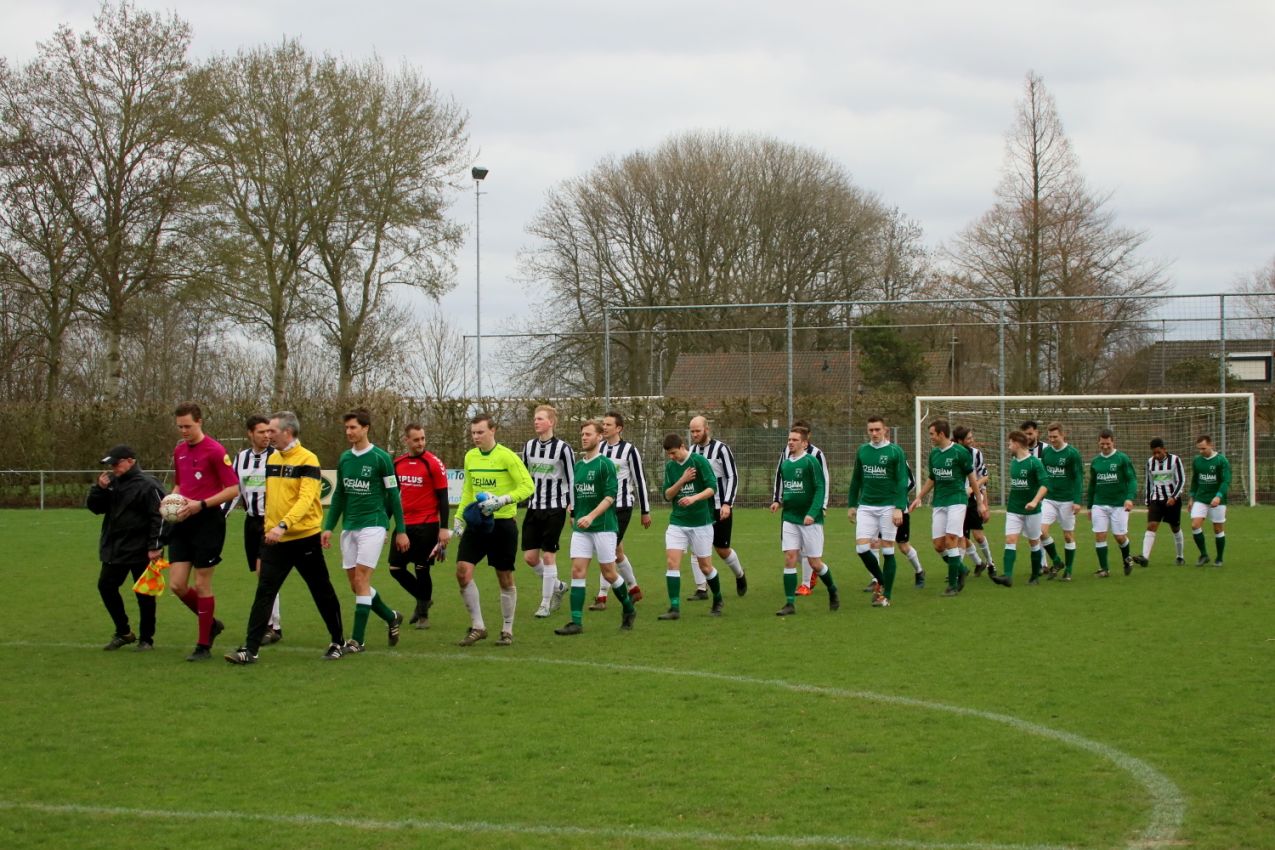 Aanvoerder Michiel Leijte won de tos en koos ervoor om de 1e helft met tegenwind te spelen in de hoop dat na rust de wind niet zou wegvallen, net zoals dat vorige week het geval was bij De Noormannen in Westkapelle. Kort nadat Veere de wedstrijd op gang had gebracht werd duidelijk dat onze groen-witten, ondanks dat het lastig voetballen is tegen een harde wind in, het betere van het spel hadden. Al na vijf minuten kreeg Niek Luime een eerste mogelijkheid, maar hij zag zijn inzet via de vingertoppen van doelman Alex Bakker rakelings langs de paal over de achterlijn verdwijnen. Ondanks dat Veere de wind in de zeilen had, had het de nodige moeite om balbezit te houden. Dat kwam doordat Zaamslag duidelijk de beter voetballende ploeg was en beter omgingen met de weersomstandigheden. De 1e helft was nog niet halverwege toen spits Niek Luime zijn tweede kans in de wedstrijd kreeg. Hij kopte in kansrijke positie uit een voorzet van Ruben de Haas voorlangs het doel van Veere doelman Bakker. Er leek dan ook geen vuiltje aan de lucht voor onze groen-witten, totdat Juriën Dam zich vergreep aan een tegenstander en scheidsrechter Rick Sturm uit Oostkapelle floot voor een vrije trap nabij de punt van het strafschopgebied. Twee spelers posteerden zich achter de bal, maar het was uiteindelijk Thijs Koster die de bal schitterend over de muur in de korte hoek krulde. Doelman Dominique Pijpelink deed nog een uiterste poging, maar moest capituleren. Deze 0-1, die duidelijk tegen de verhouding in was, was ook de ruststand. Nog voldoende tijd om in de 2e helft op zoek te gaan naar de gelijkmaker en mogelijk meer.