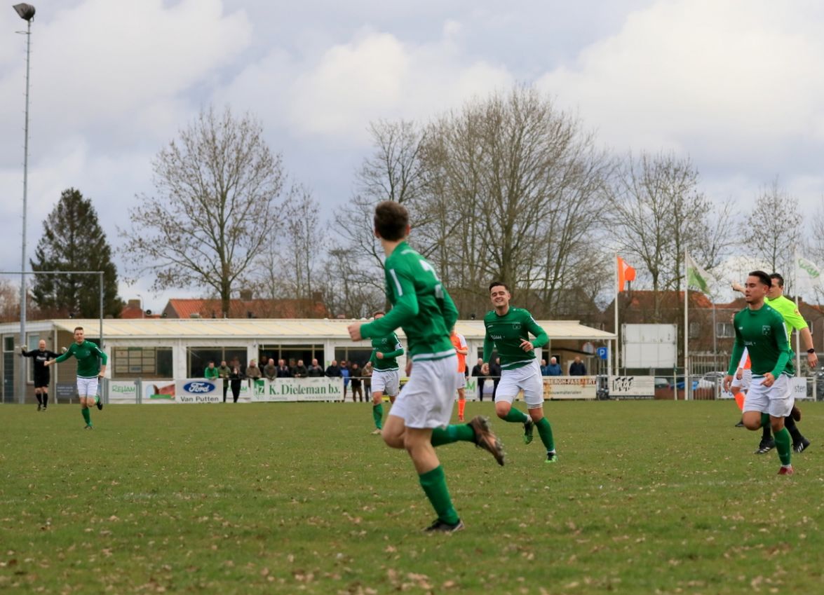 Na tien minuten kwam de bal, na een handig overstapje van Senna Bunt, bij Lars de Jonge. De voorzet van de rechtsback kon net niet tot doelpunt worden gepromoveerd door Stijn Dekker, die de bal op een haar na mistte. Twee minuten later schoot Stijn Dekker op aangeven van Wout Hamelink via de vingertoppen van doelman Dylan de Kam rakelings over. Onze groen-witten speelden één van hun betere wedstrijden, zo niet de beste, sinds lange tijd. De bezoekers uit ’s-Heerenhoek kwamen er nauwelijks aan te pas. Verdedigend, met in het centrum naast Roy van der Staal een debuterende Fabrice van Holsbeke in de basis, bleef de ploeg bijna moeiteloos overeind tegen de vooraf gevreesde aanvalsmachine van De Patrijzen. Daarbij was een positieve rol weggelegd voor Fabrice van Holsbeke, die het in hem gestelde vertrouwen van zijn trainer niet beschaamde. Het onder aanvoering van Koen Post en Arno Scheele hard werkende middenveld had de wedstrijd onder controle en dat zorgde ervoor dat de ploeg steeds vaker in het strafschopgebied van de tegenstander verscheen. Halverwege het eerste bedrijf mocht aanvoerder Koen Post aanleggen voor een vrije trap. Van grote afstand probeerde hij het in één keer en bijna met succes. Het schot was doelman Dylen de Kam bijna te machtig. Tot zijn schrik glipte de bal door zijn vingers, maar de opluchting was groot toen hij de bal net over zijn doel zag verdwijnen. Daarmee was het gevaar voor de bezoekers nog niet geweken, want uit de hoekschop schoot Senna Bunt gevaarlijk op doel. Zijn inzet kon op de doellijn worden gekeerd, waarna Stijn Dekker in de rebound net naast besloot.